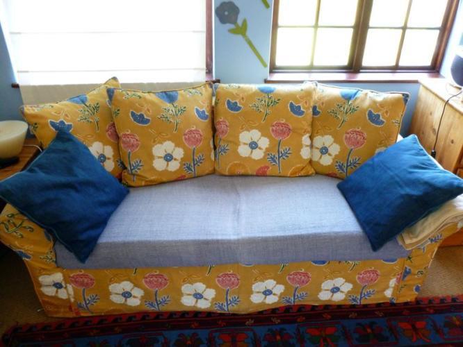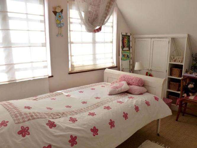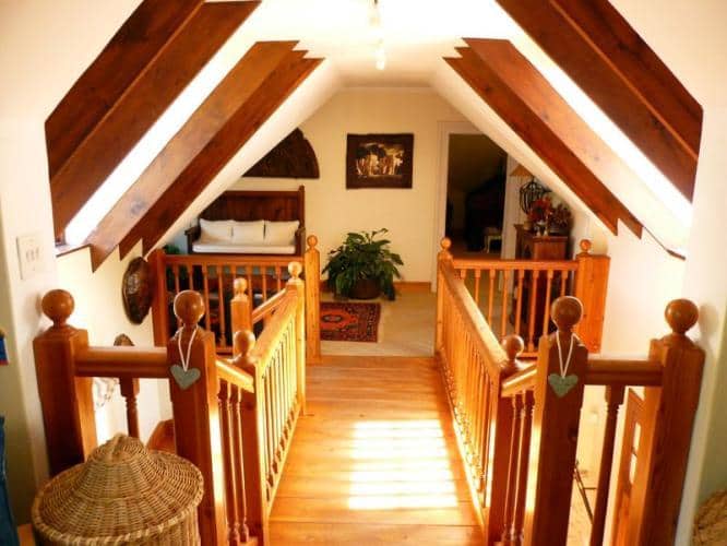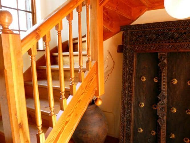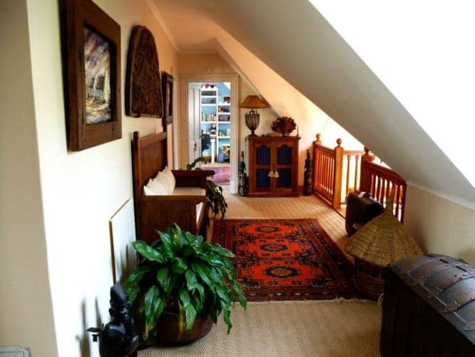 Up with the stairs to the bedrooms. Dark and rich stair case. On the landing your are welcomed with colourful carpets and warm light joining the rooms. Each room is spacious. With views on the garden, the milk wood trees and the sea. (The sea is about 1 kilometer as the crow flies).
