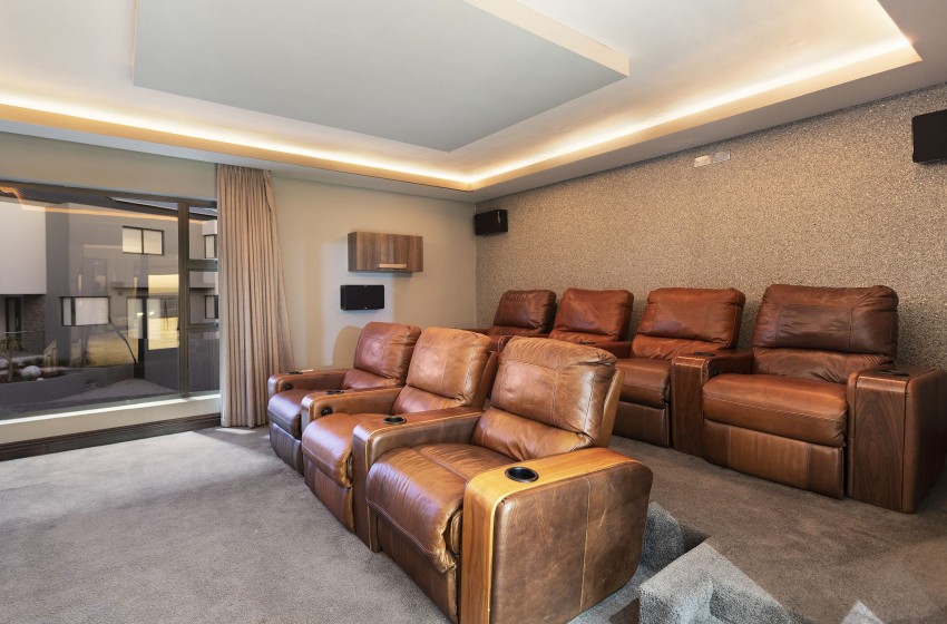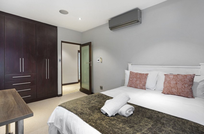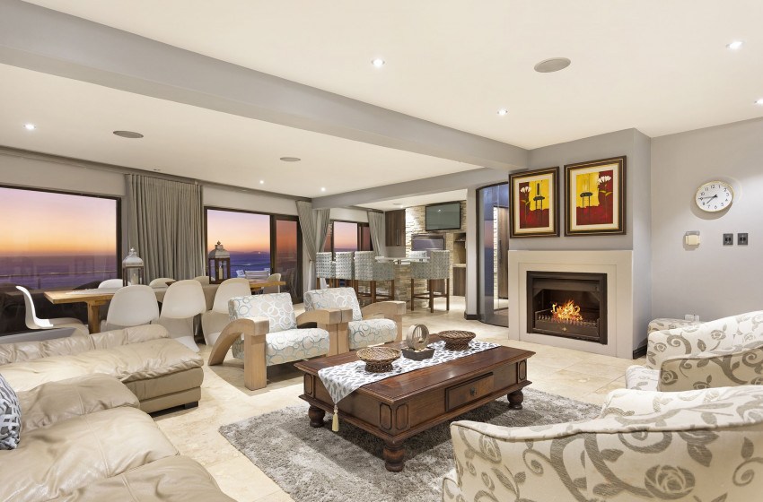 The main living area is bright and airy thanks to the ample floor-to-ceiling windows and sliding doors leading to the extended balcony with seating for 10 people. The interior features a large lounge with a built-in fireplace, an 8-seater dining area, a guest toilet, and a fully equipped kitchen any chef would love! A built-in braai area with seating and a bar fridge provides the perfect place to entertain regardless of the weather.