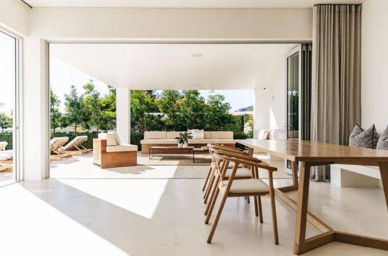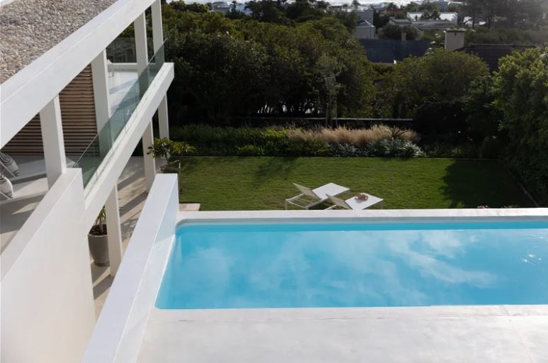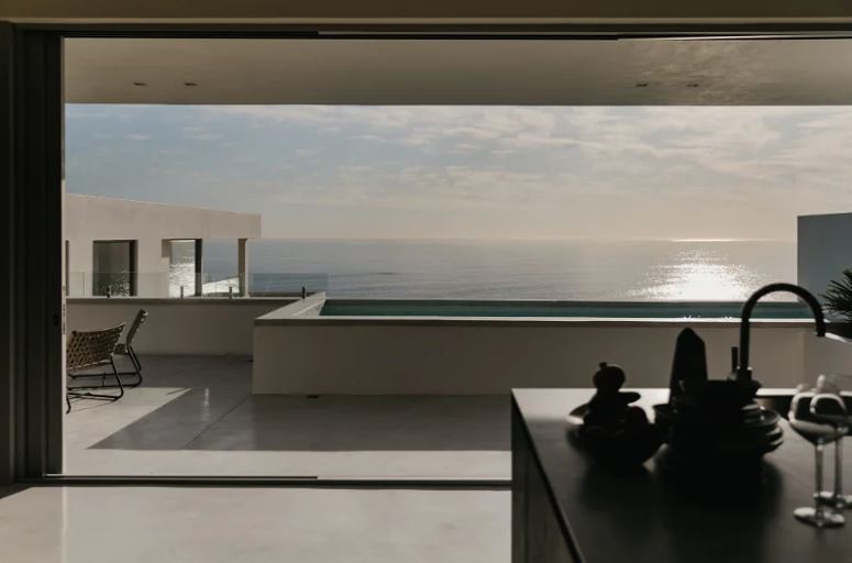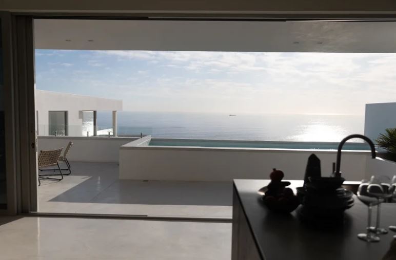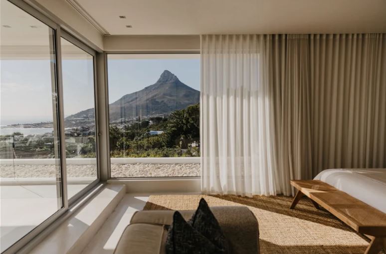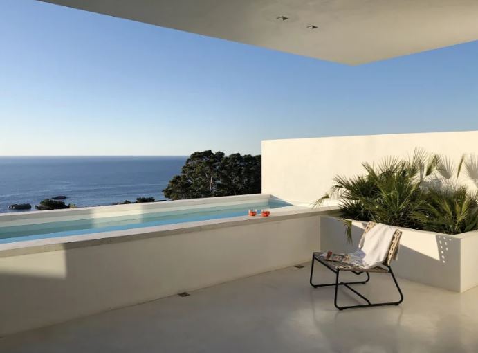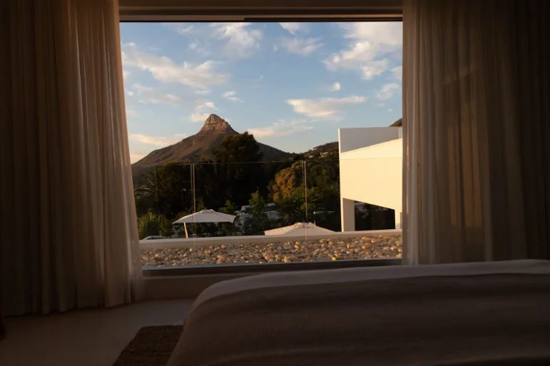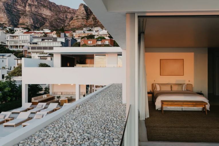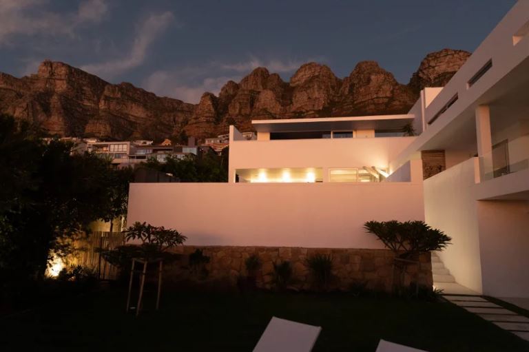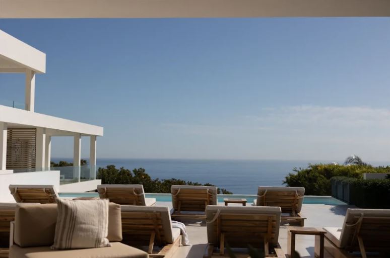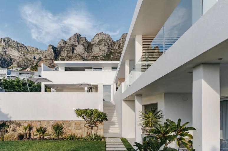 With its clean lines of white etched against a blue sky, the villa appears to hover like an elegant spaceship above perennially popular Camps Bay. Architecturally modernist in style yet cocooned by trees, it is a completely private haven, with sparkling ocean views framed by uncluttered, big-volume spaces – gallery-style cubes that offer a cool retreat from the blue hues and summer heat.