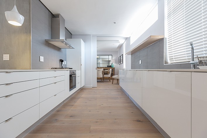 Bright and airy living spaces, which has been stylishly decorated in contemporary-chic tones, greet you on arrival in the apartment with an open-plan lounge and informal sitting area – connecting seamlessly with a dining area. The dining table seats 8 and leads off the kitchen.