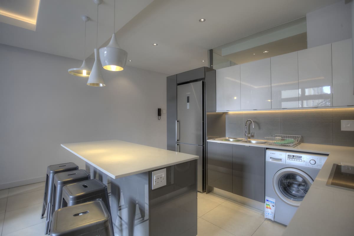 The apartment is light, airy and has a relaxing free flowing feel. The open plan kitchen and living area is chic, stylish and opens onto a cute private outdoor patio area with seating area. The kitchen is fully equipped with top end appliances and a central island counter for dining and storage. There is a flat screen TV available, which can be viewed from large comfy sofas.