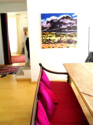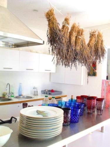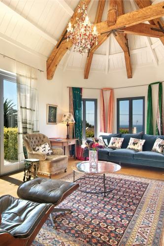 In the spacious lounge, windows are flung open wide and jewel-coloured, silk curtains billow. Beezy’s Chinese gangster-cushions glower from the couch – a spark of personality from the artist himself whose signature textiles cover much of the comfortable furniture throughout. Above, beautiful yellowwood rafters (from which the house gets its name) form a unique tower whilst below eclectic artwork covers the walls. The cheery, open-plan dining area leads to the kitchen where fragrant lavender hangs over an island of funky glasswear.
