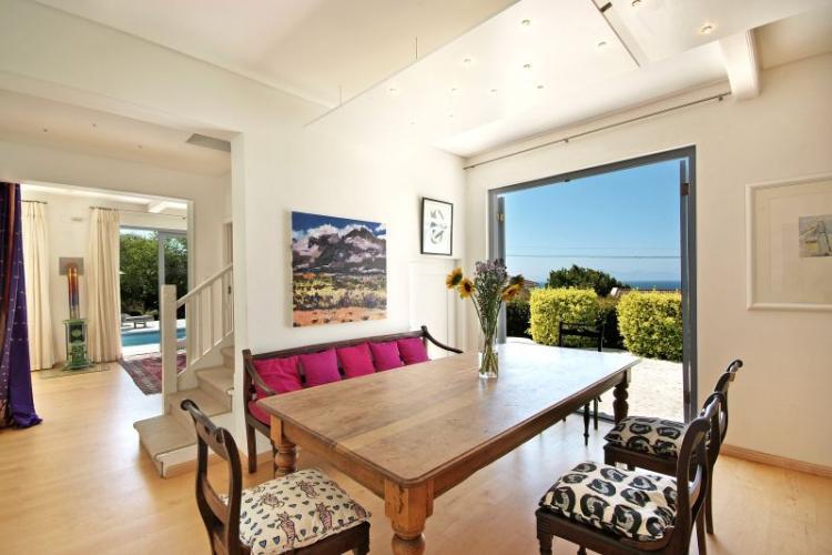 The upstairs houses all the bedrooms… and a peek into each reveals more delightful textiles, colourful crystal chandeliers, a wooden Zanzibar bed and other quirky oddities all offset by large balconies, each with sprawling views and a front seat to any whale watching action in False Bay.