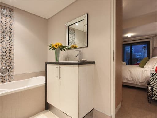 Spacious and elegant, the en–suite Master bedroom has wall mounted plasma TV and direct access to the balcony with breathtaking views of the mountain and city. The en-suite bathroom has a large bath, basin and mosaic features with cool grey marble finishes. The guest bedroom has a queen size bed and is tastefully decorated in colours of warm orange, cream and grey. The guest bedroom with separate shower has cool tones of beige and dark greys.