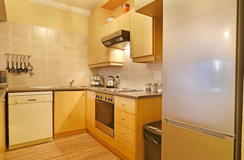 The fully equipped kitchen includes a kettle, toaster, microwave, dishwasher, fridge and freezer as well as an oven and hob.