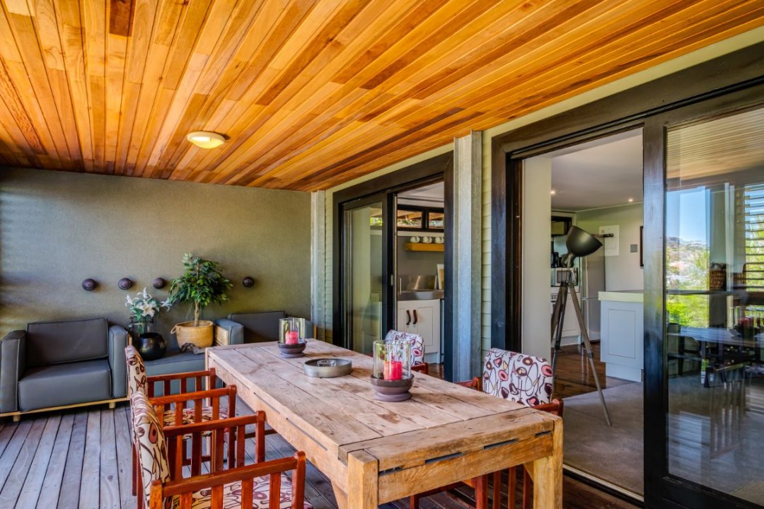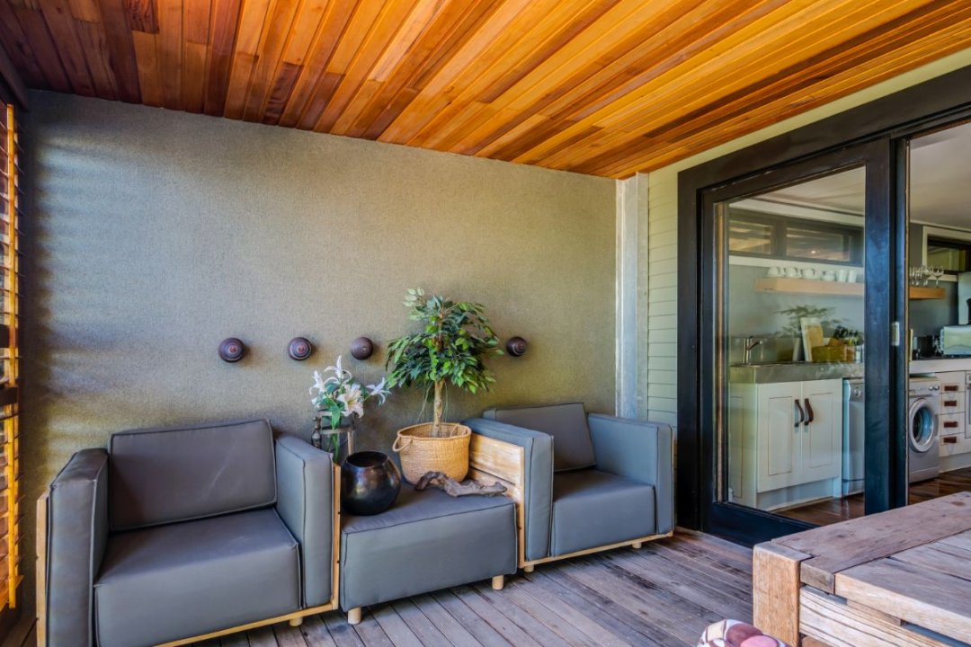 Open plan to kitchen and access to a wooden deck, balcony, TV with satellite, DSTV