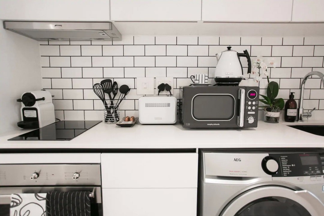 The kitchen has all the necessities as well as a washer dryer combo, SMEG appliances and a Nespresso machine.