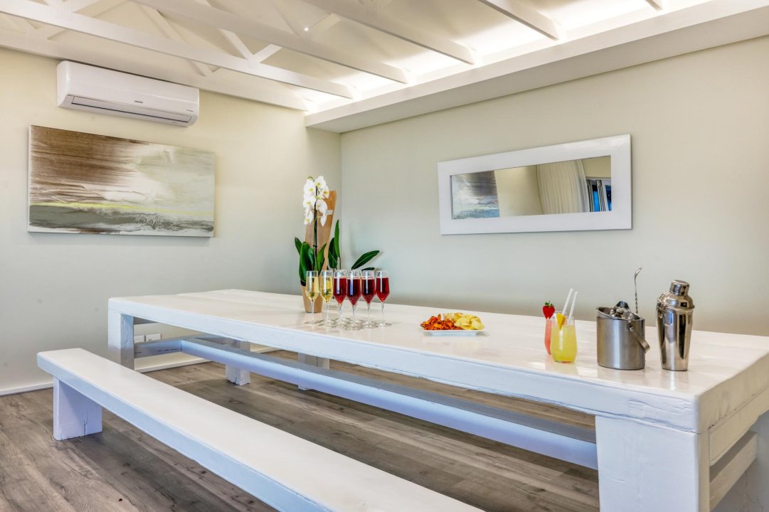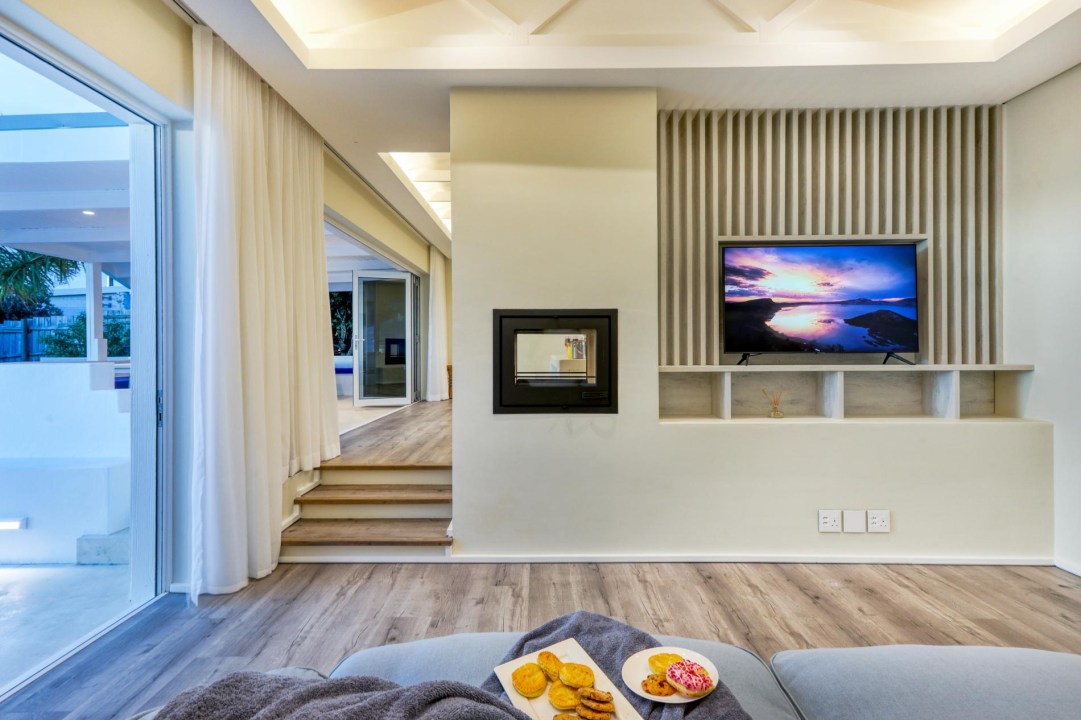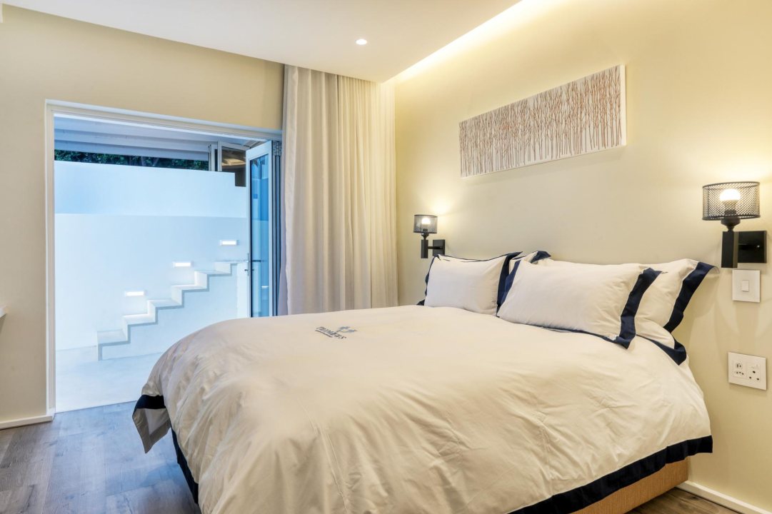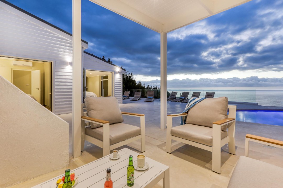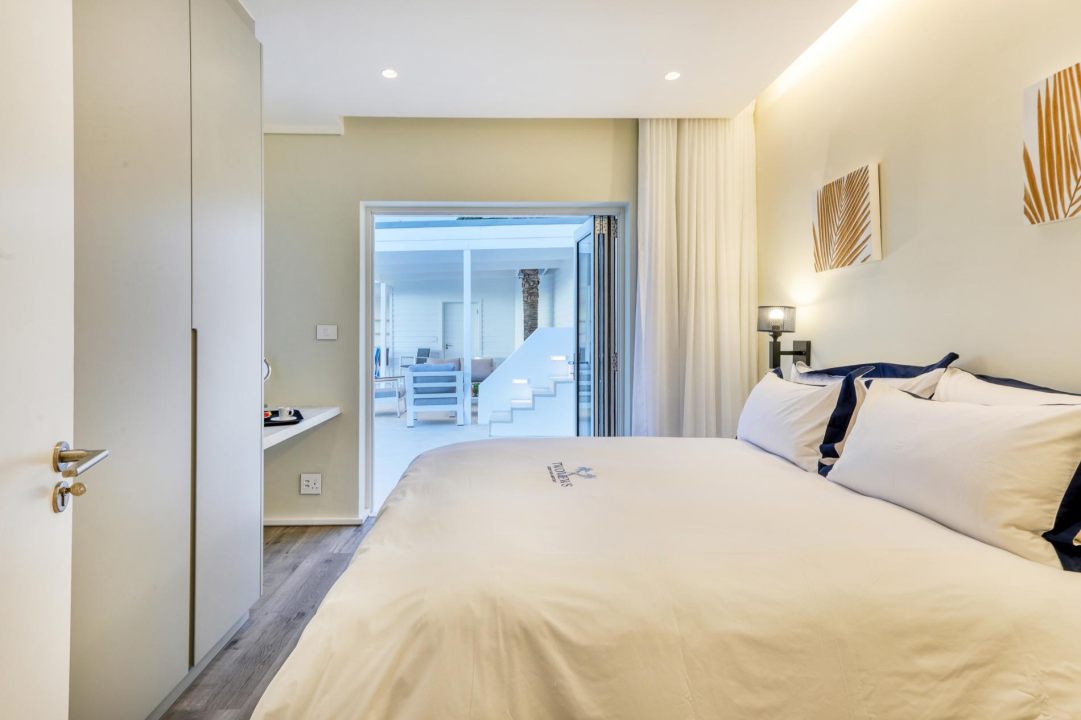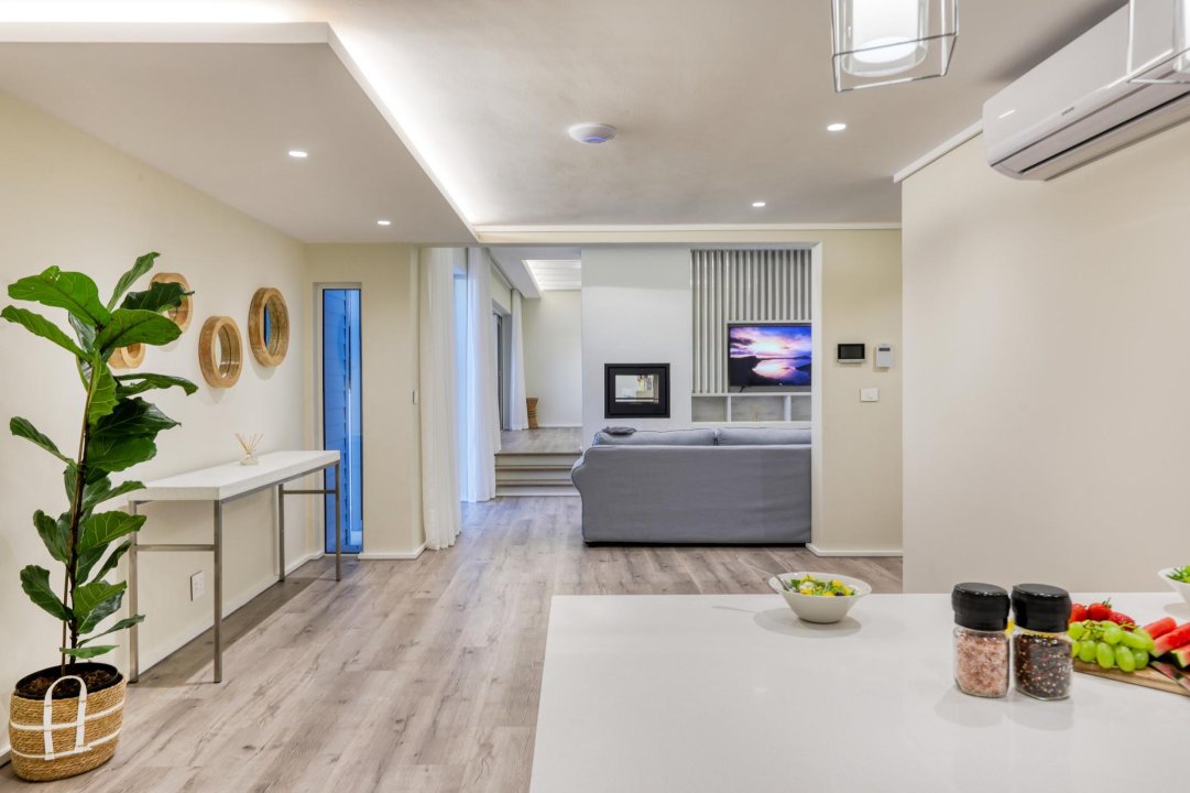 Set across three split levels, Two Views captures panoramic sea and mountain vistas from almost every room. Floor-to-ceiling glass sliders open to wide terraces, allowing the ocean breeze and natural light to flood the open-plan living spaces. Contemporary coastal décor in soft tones of white, cream, and stone amplifies the villa’s calming beach-house aesthetic.