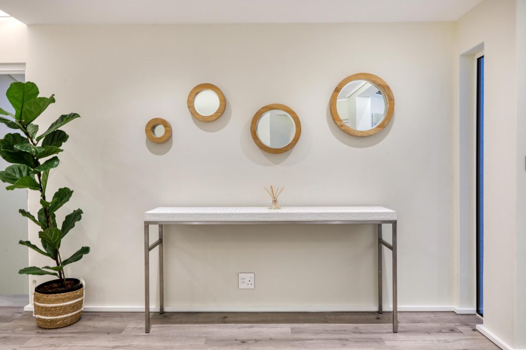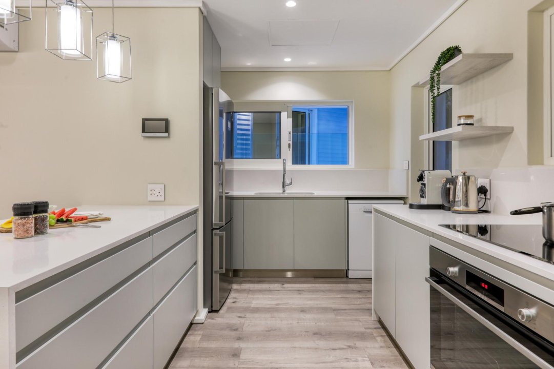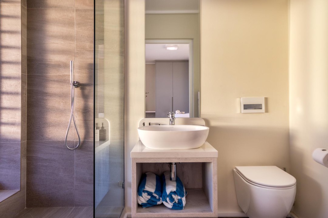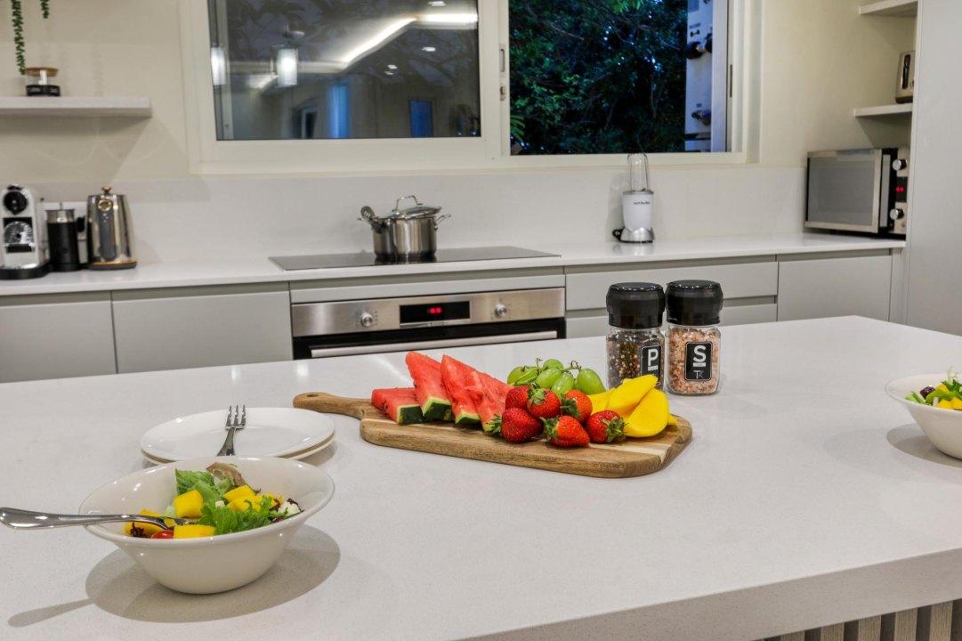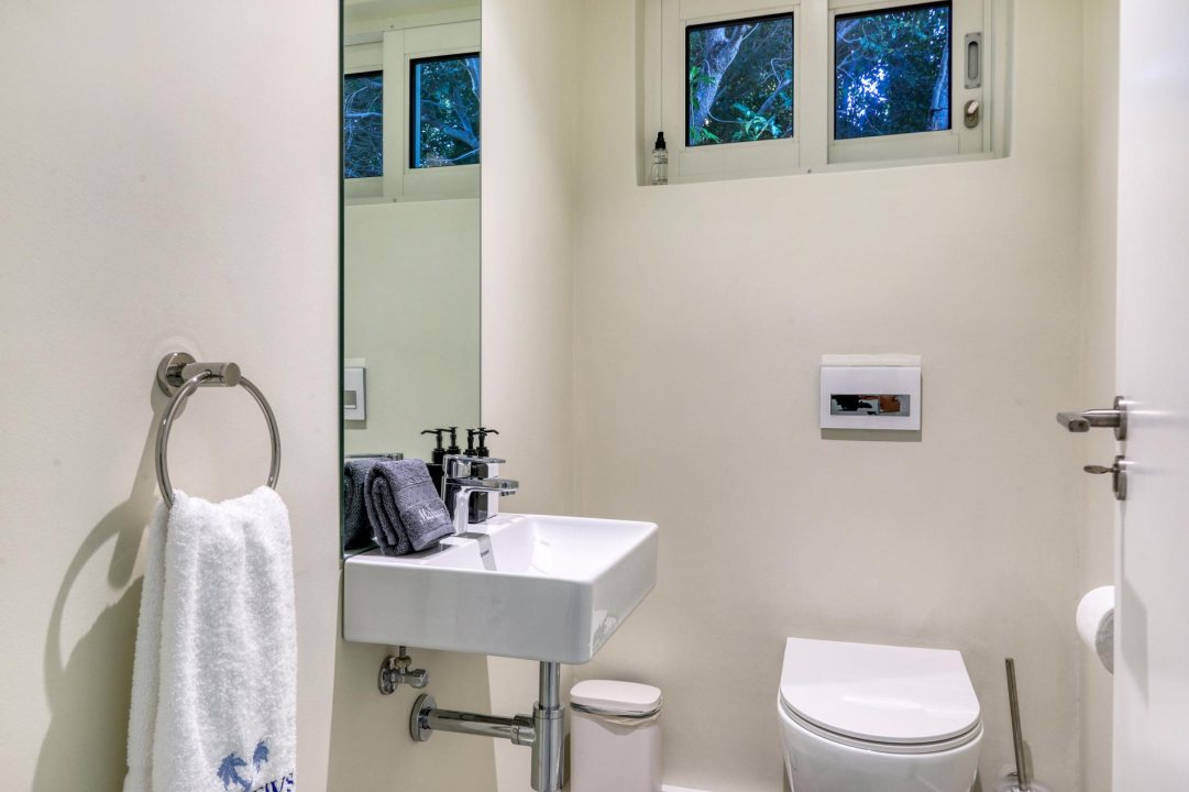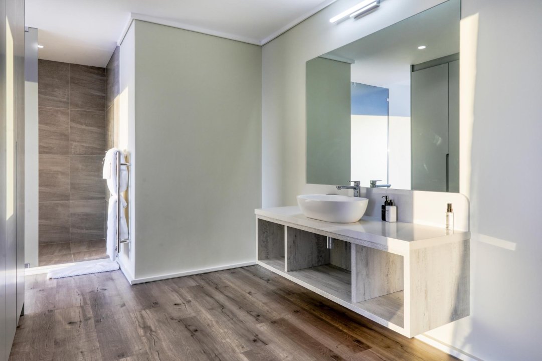 Set across three split levels, Two Views captures panoramic sea and mountain vistas from almost every room. Floor-to-ceiling glass sliders open to wide terraces, allowing the ocean breeze and natural light to flood the open-plan living spaces. Contemporary coastal décor in soft tones of white, cream, and stone amplifies the villa’s calming beach-house aesthetic.