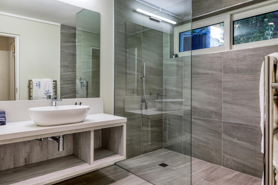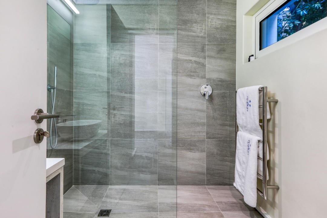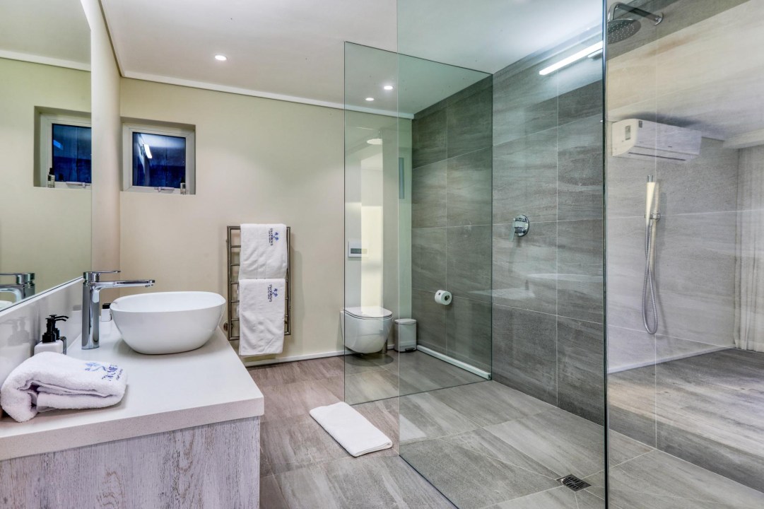 Eight beautifully appointed queen-bed rooms are arranged evenly across the villa’s top, middle, and lower levels. Each bedroom is styled in fresh whites and natural textures, with either en-suite or shared bathrooms featuring walk-in showers. Many suites boast breathtaking ocean or mountain views, while others offer a peaceful retreat with partial vistas.