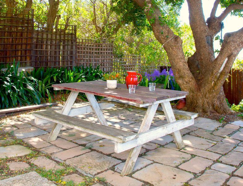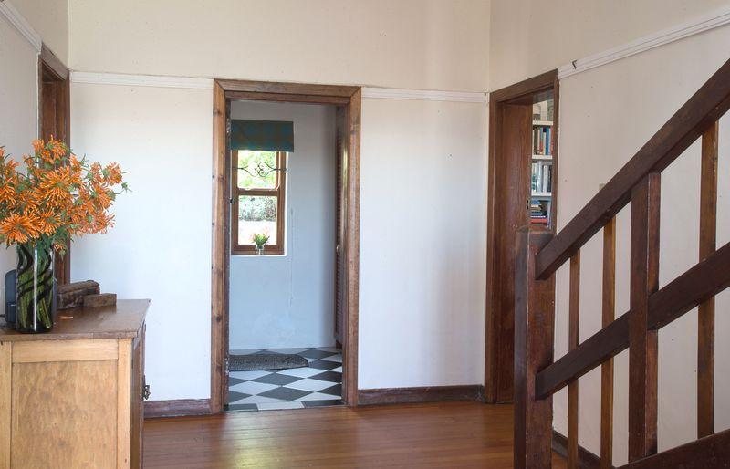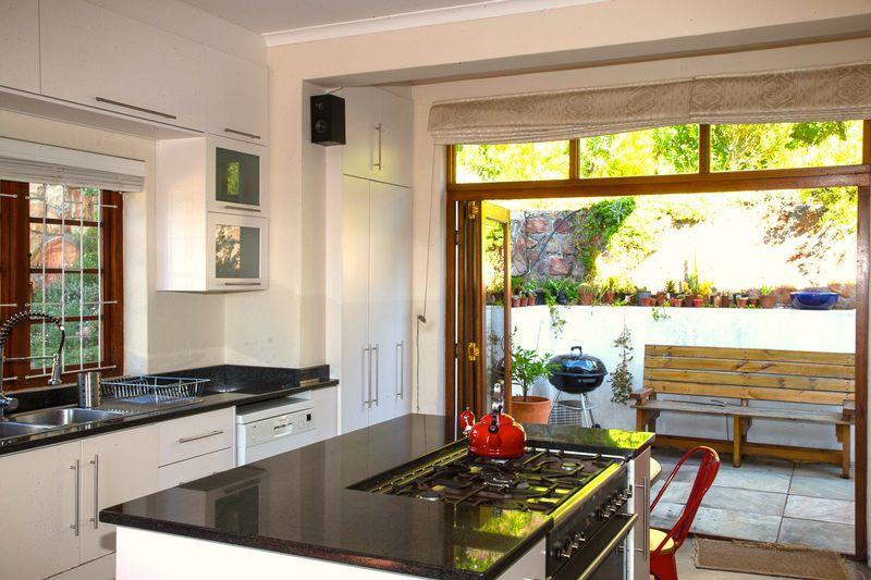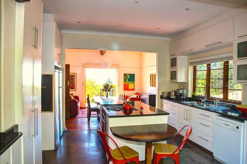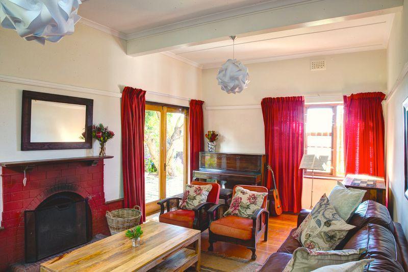 As you drive up to the home you can park on the street or in the garage. Here you will notice many similar characterful homes. Getting out of the car you’ll walk a few steps down to the house, past a large tree where you can sit and watch over False Bay and have a braai.