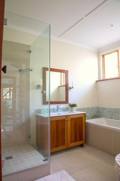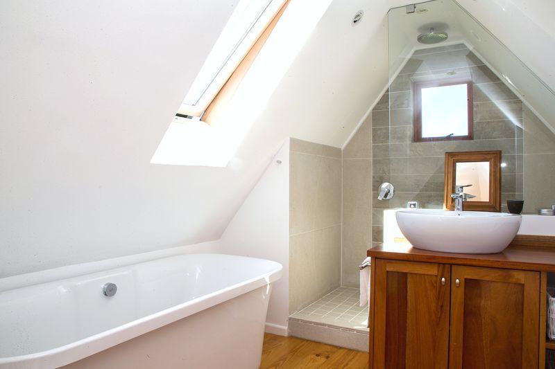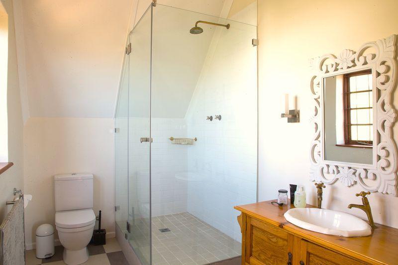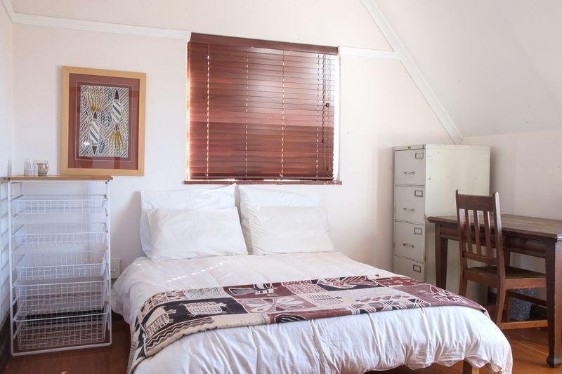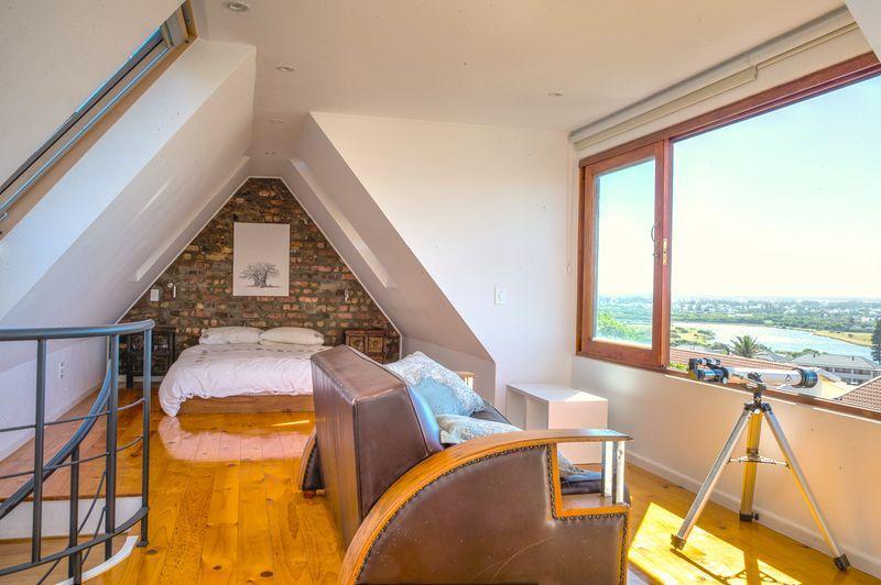The main bedroom is not only spacious, it’s a beautiful loft. On one side is the bed, then the lounge area and on the other side the romantic open bath, and bathroom. Just imagine yourself sitting in front of the large open window, on the comfy chairs, taking in the expansive view over Muizenberg and the rest of False Bay. This light filled room can easily be your own private penthouse – away from all the other rooms of the house.