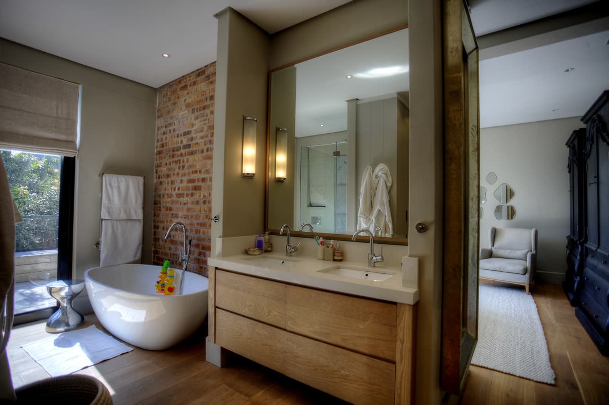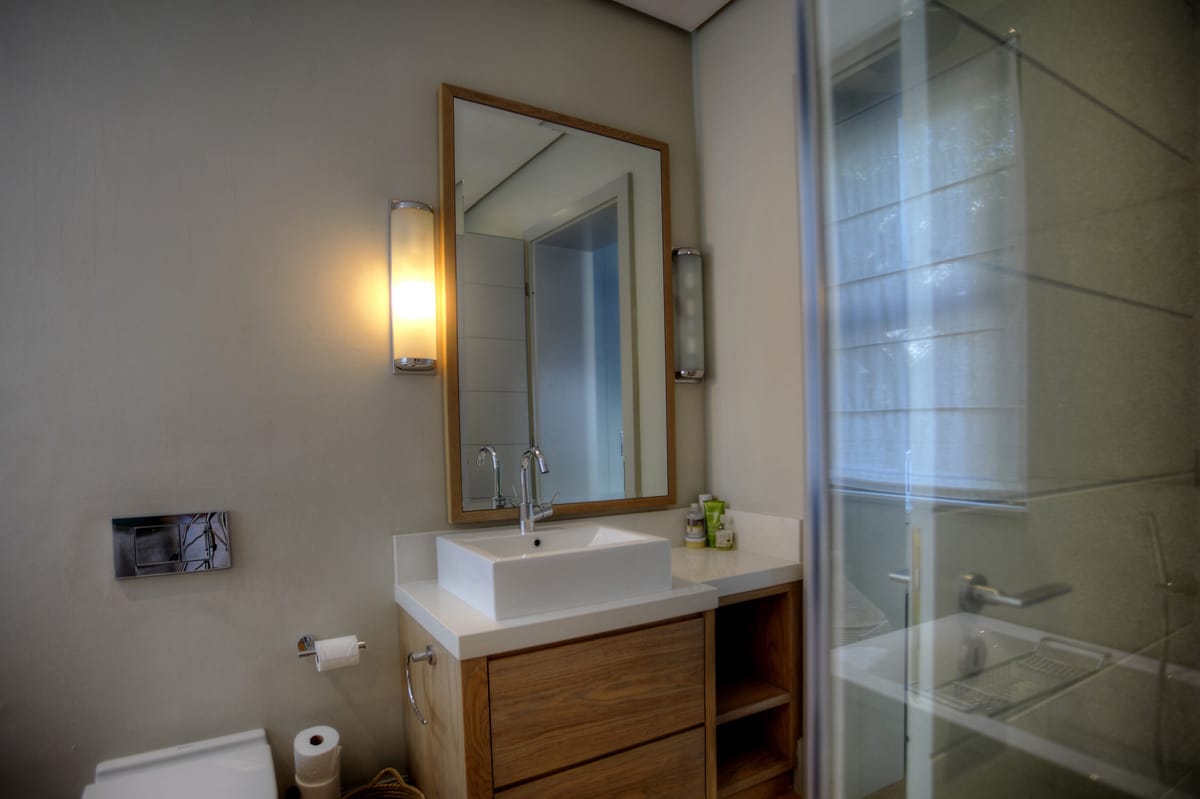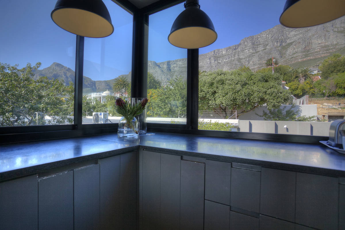 A third bedroom also has a en-suite bathroom. It has two single beds that can be converted into a king size bed if requested. This bedroom has French doors which lead out to a courtyard where you can enjoy the view of Table Mountain.