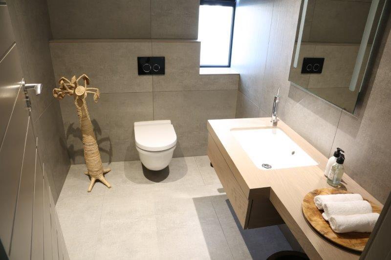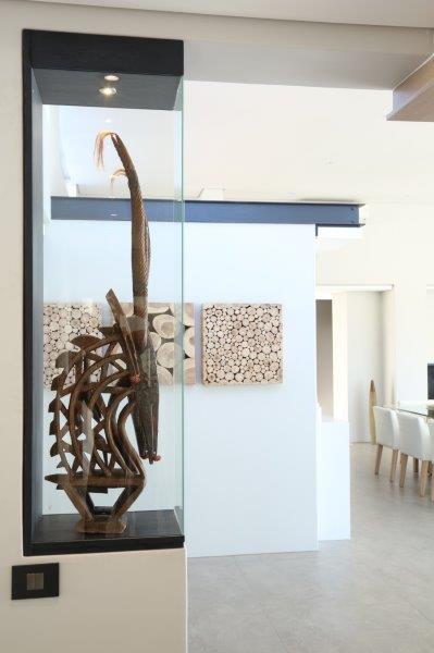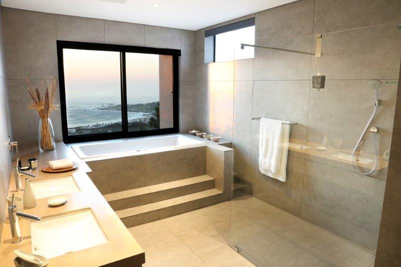 The outdoor entertaining area on this level is exceptional. Expansive, top quality balau decking houses a rimflow saltwater pool, six seater jacuzzi and second large built in braai; there is even exterior heating and air conditioning in this space. It goes without saying that the views are no less impressive, and the glass balustrade on both floors maximises the impact. Whilst the azure brilliance of the ocean is in evidence throughout this lovely house, it also revels in having the Table Mountain Nature Reserve at its back door, and a plethora of well positioned windows guarantees plenty of mountain vistas. Nature is celebrated, not only by the location and views but also in the clever use of simple, high quality materials and subtle colour palate that stay true to the surroundings. In keeping, the house has excellent green credentials: it uses solar energy, and rain and grey water are captured in two 5000l holding tanks under the lower level balcony. The grey water will be used to irrigate the garden. Insulated concrete roofing offers maximum thermal efficiency, and double glazing on the upper level complies with Energy Efficient regulations. Both measures also create a completely tranquil environment, in harmony with the natural exterior.