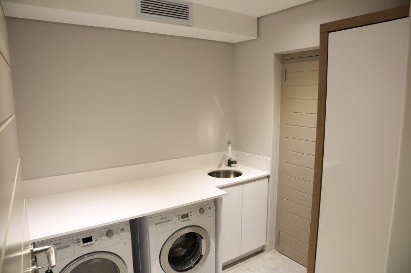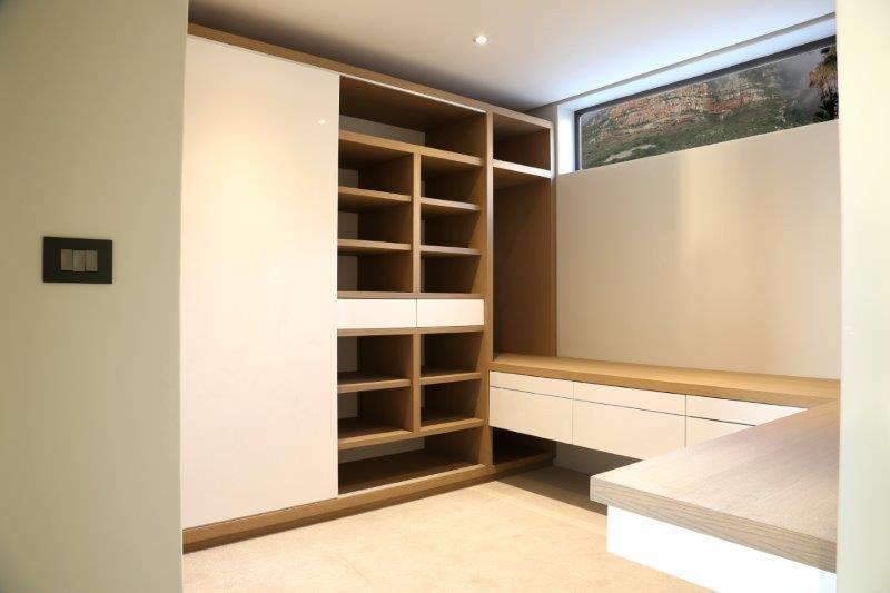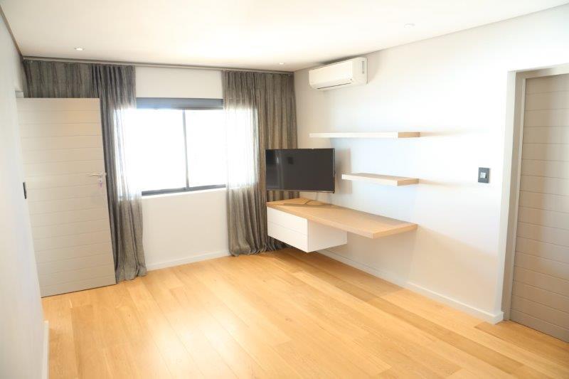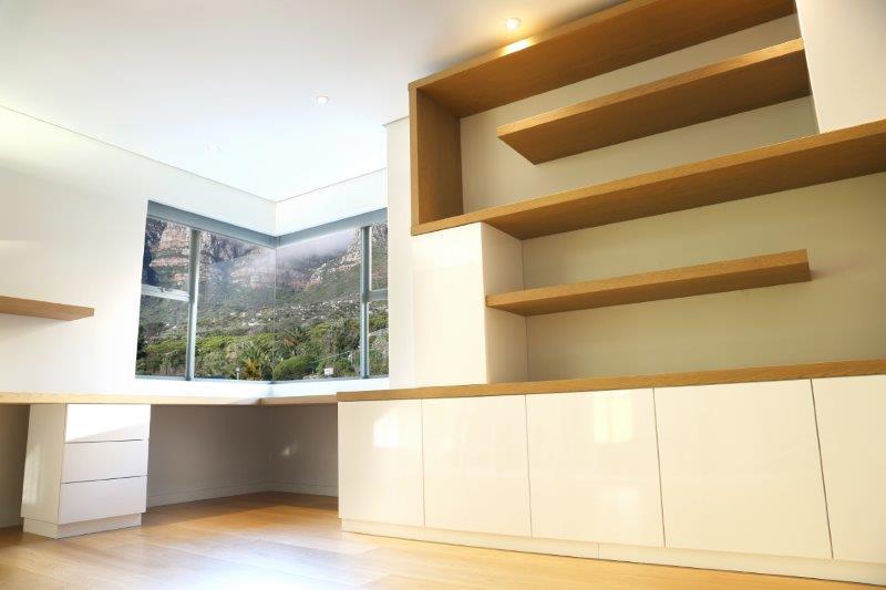 Floor to ceiling doors and windows, and a wrap around balcony, allow you to marvel at this view with ease. The living area is beautifully appointed, with a luxury fitted kitchen, separate bar and TV lounge inside, and outside a viewing deck with built in braai. On this floor is the expansive master suite, which has a dressing room, luxurious bathroom with spa bath and double sink, and private access to the exterior. The second, spacious guest bedroom has a full bathroom and large built in wardrobes. There is an office with wall to wall shelving and mountain views, and a guest toilet. The lower ground floor is essentially self contained, accessed both via the main staircase, but also via an entrance from the street level driveway. It has a fitted kitchen and lounge area, its own master bedroom with private living room and a second spacious double bedroom. Both bedrooms have full bathrooms, and the beautifully constructed customised storage which characterises the entire property. This floor also houses a separate laundry and linen room, a study area and guest toilet. There are staff quarters, which could easily become a self contained apartment This is ideal for one’s nanny, chef etc.