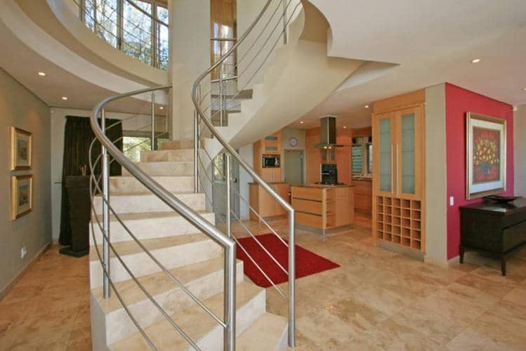 Grand spiral staircase leading to upper residential levels with wrap around balcony’s, tv lounge and tree shaded wooden decks
