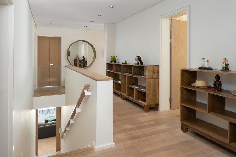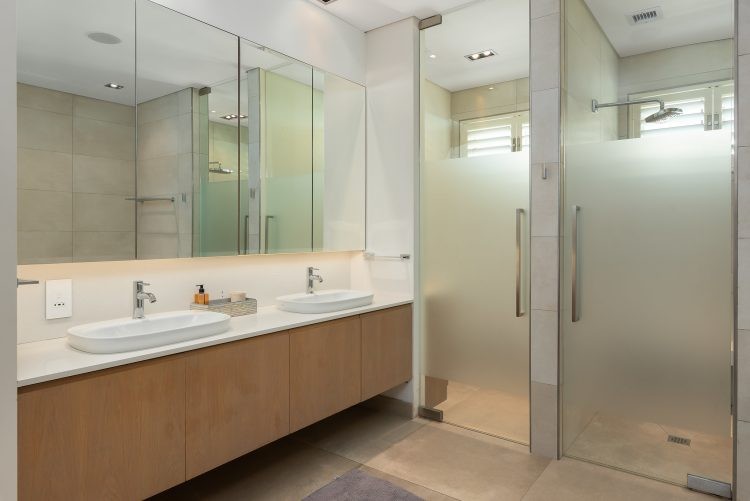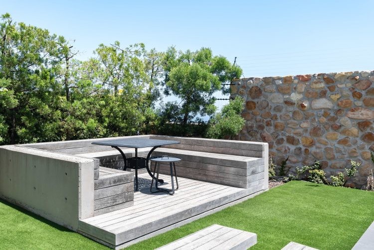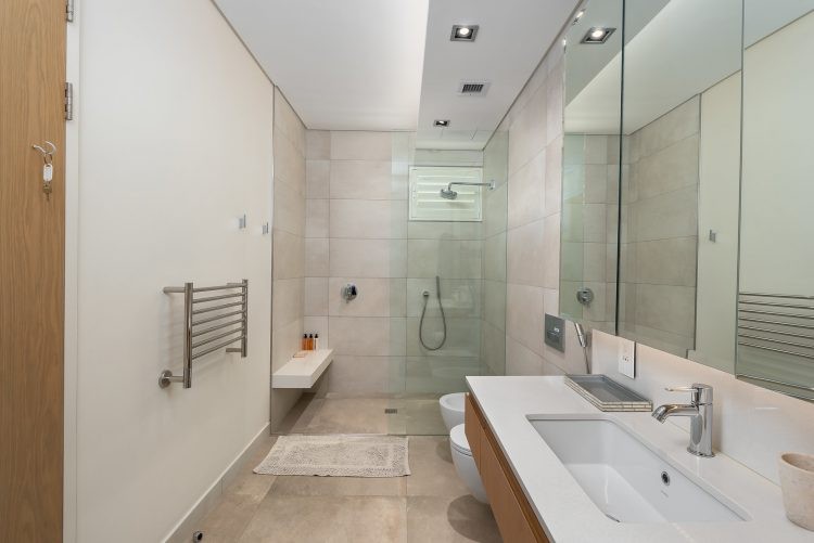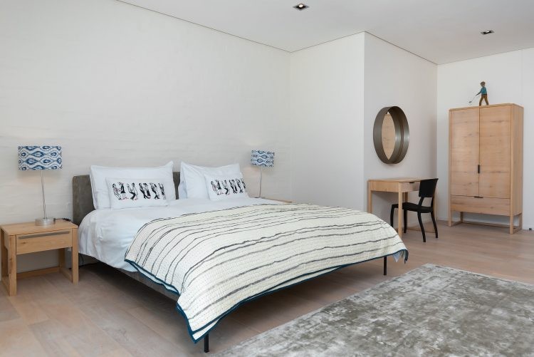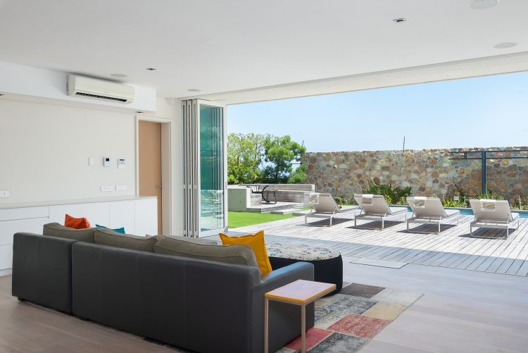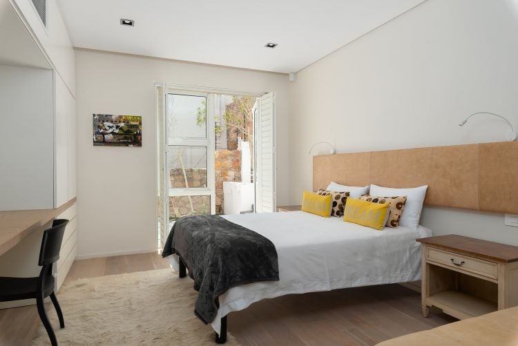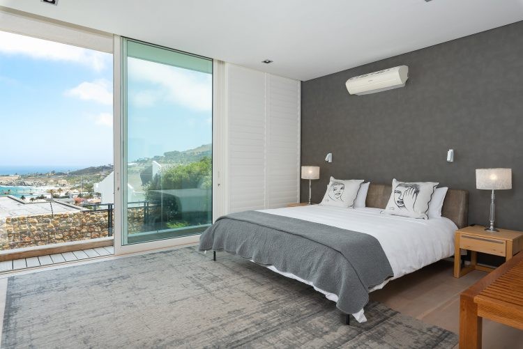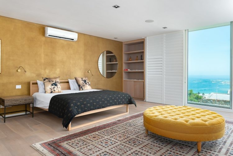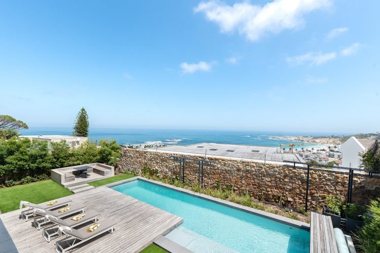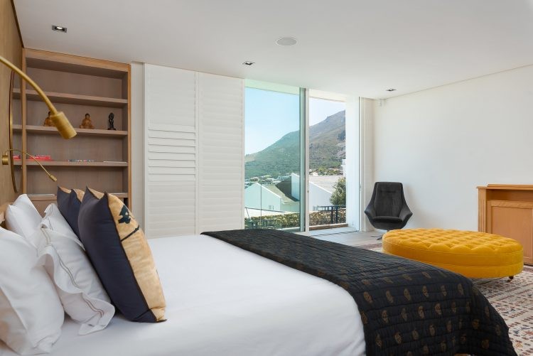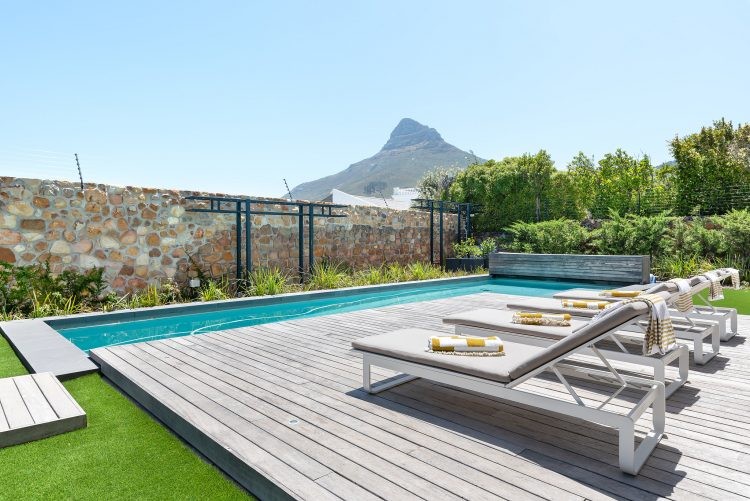 The ground floor is home to the pool and patio area that is designed for maximum relaxation and calm. An open plan sun lounge opens up to manicured gardens and a sparkling pool that is encased from the world outside with lush foliage and a rustic retaining wall. With loungers, patio furniture and a kitchenette, it’s the ideal space for a leisurely brunch or afternoon cocktails before heading upstairs for sundowners and that view. Unusually for villas in Cape Town, the pool is heated which means you can enjoy a swim all year round.