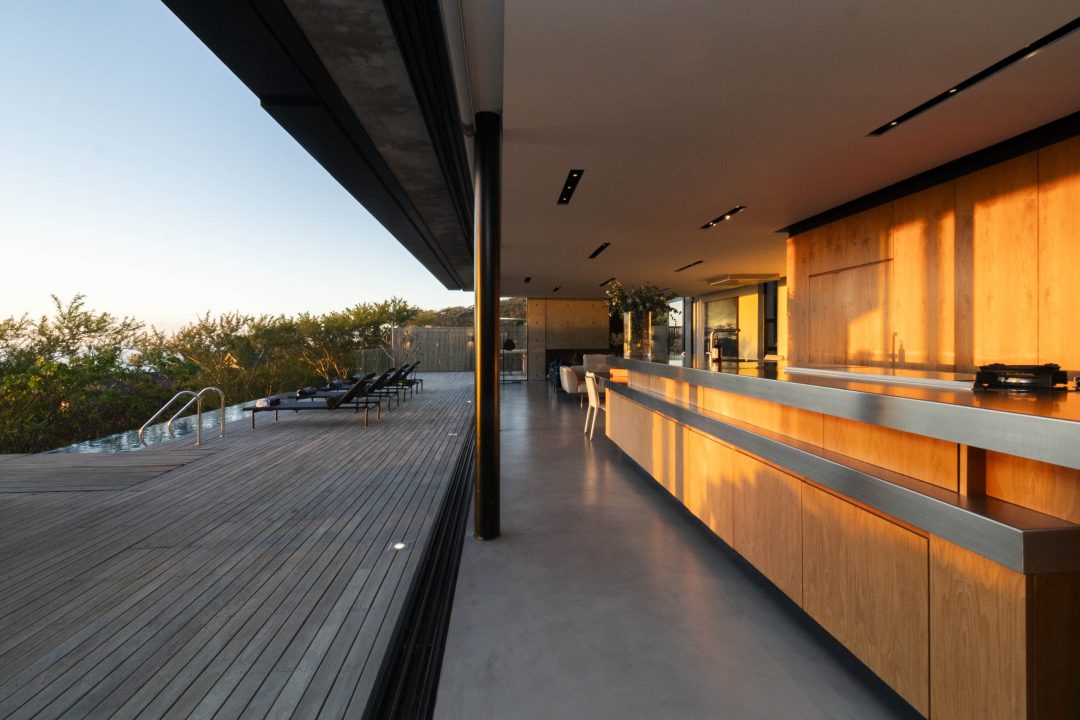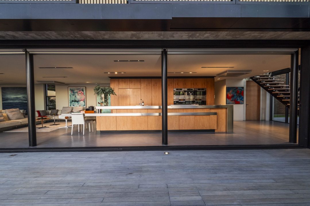 Large glass doors open onto the outdoor patio and pool area, allowing the indoor spaces to flow seamlessly into the garden and entertainment areas.