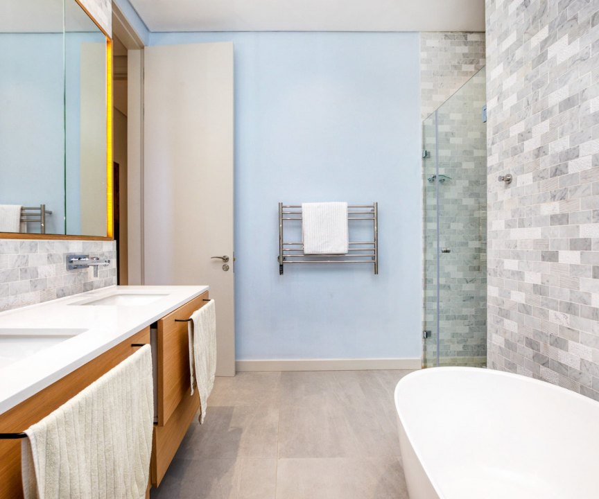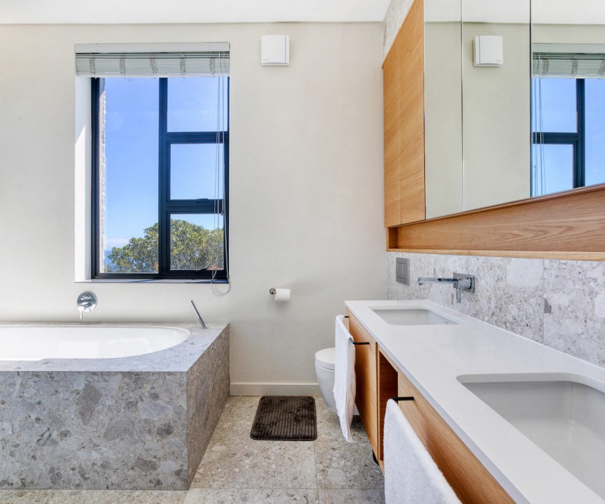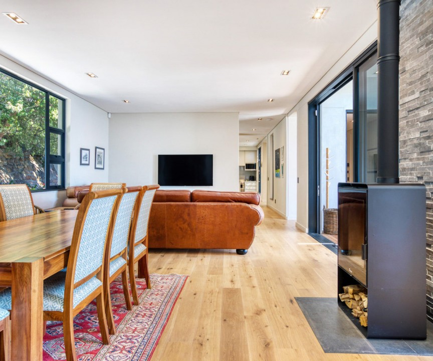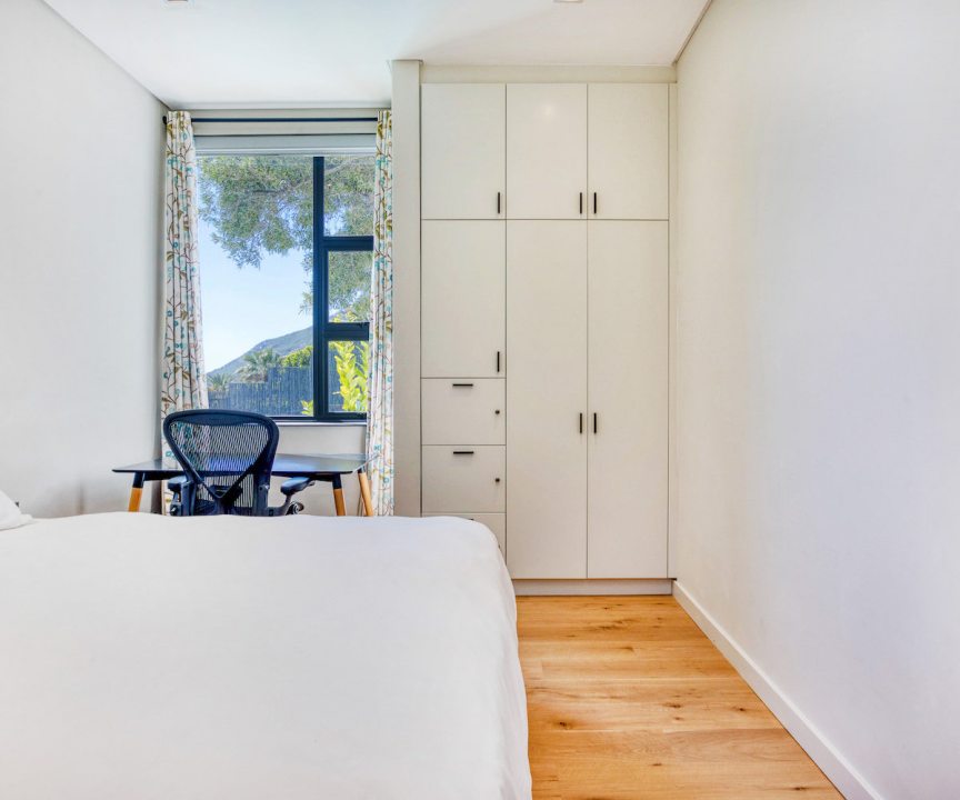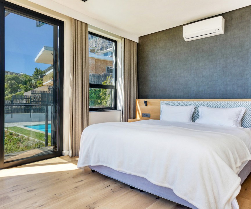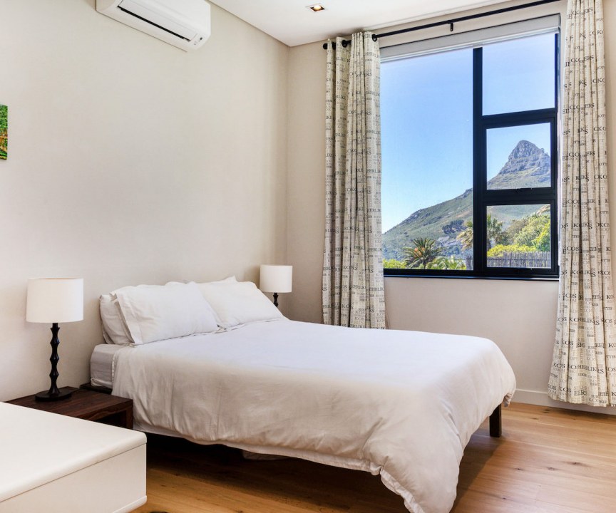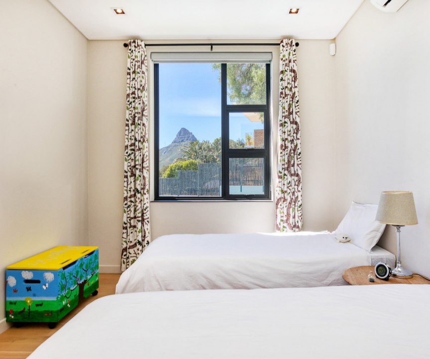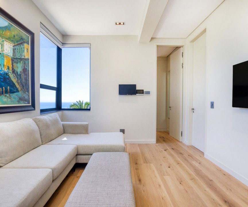 The house comprises a master bedroom suite with en-suite bathroom (bath and shower) and balcony with sea and mountain views. The master bedroom has a King bed, extra length, air conditioning and plenty of cupboard space. The views are spectacular, both of the sea and Lions head. There are then three further bedrooms along the same corridor (2 twin rooms and one double), and these rooms share a bathroom (bath and shower). They are all equipped with air conditioning and look onto the garden and Lions Head behind. Between all the bedrooms is a pyjama lounge with TV and there is a further guest loo in the entrance hallway. All bathrooms have underfloor heating and heated towel rails.