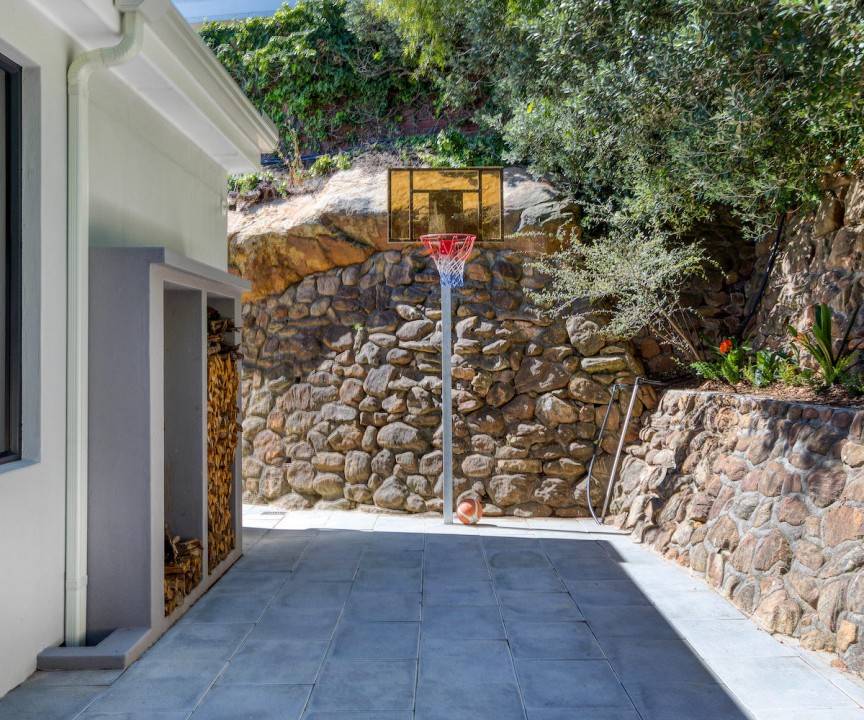 Next to the kitchen is a children’s play area with small table, piano, book shelf and drum kit. This opens up onto the back patio which has a pizza oven, outdoor dining table and basketball net. A lovely area that can also offer some shade from the hot mid-day sun.