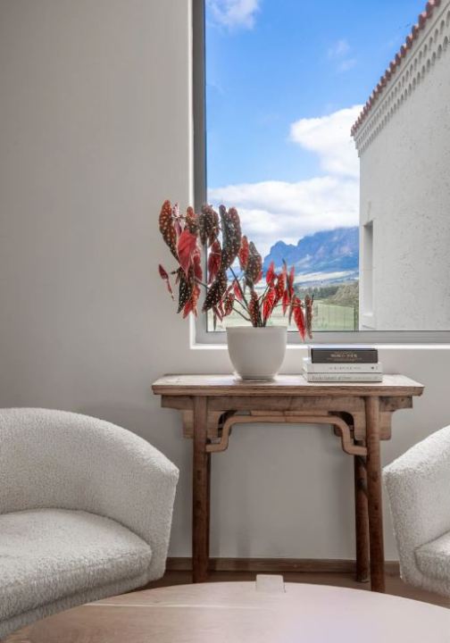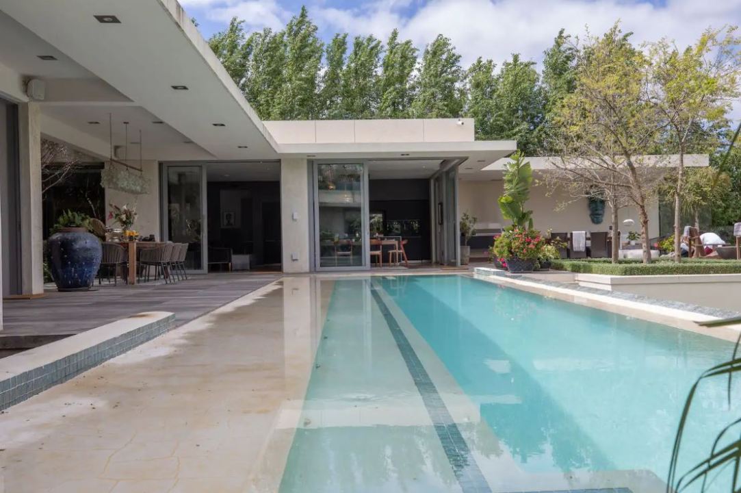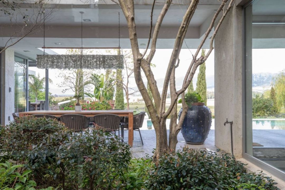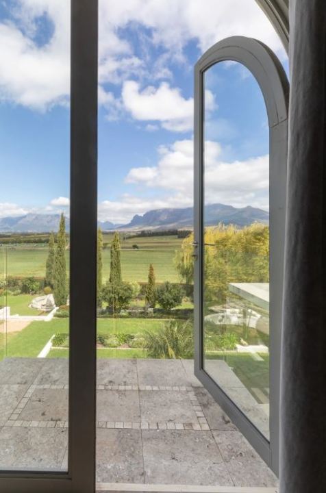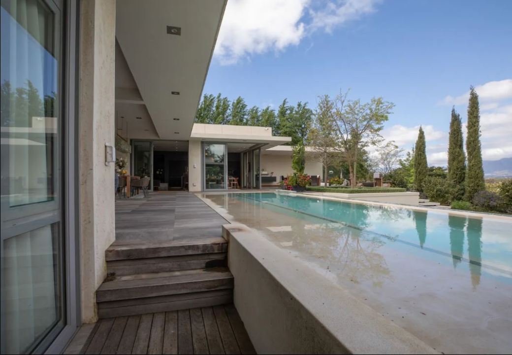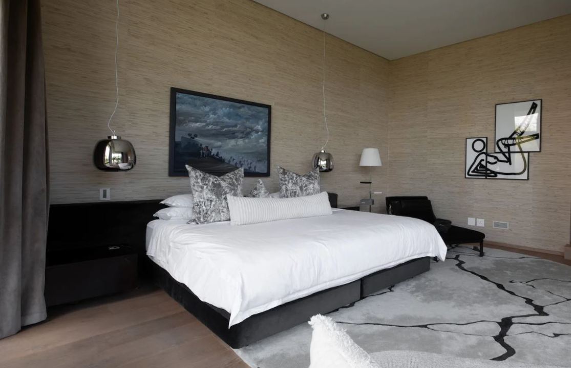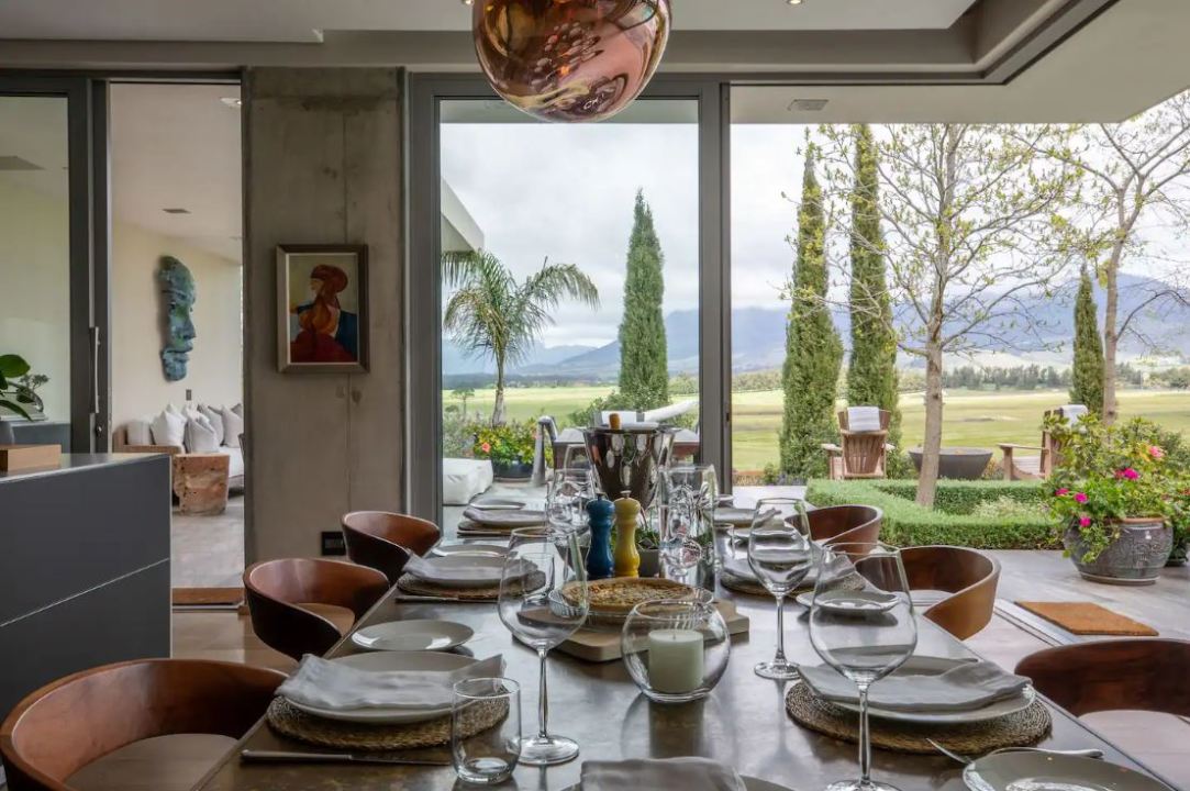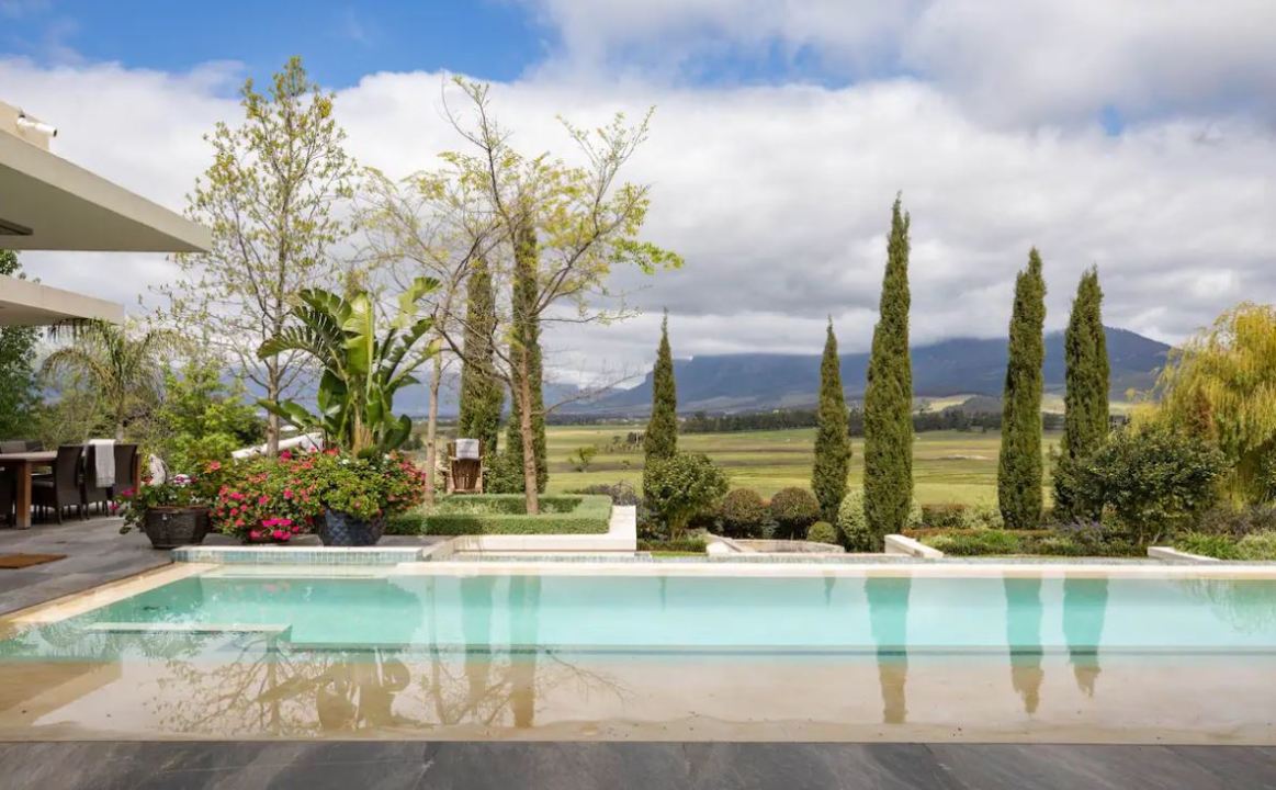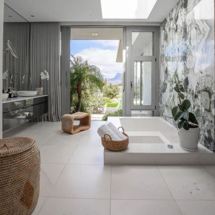 This luxurious 6-bedroom villa is hidden in a tranquil and private setting in Winelands Estate, with the best view of the Helderberg mountain range. Enjoy the rich, vibrant decor that exclusively showcases work from the best local artists and artisans.