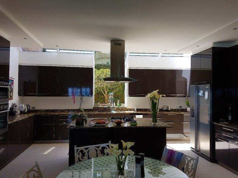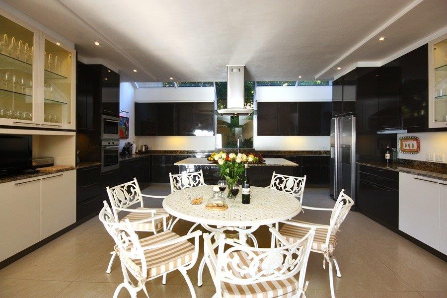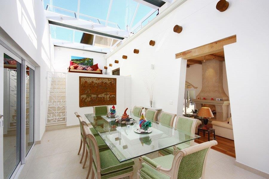 The formal dining room is in a glass conservatory style room with lots of light and views of the mountain and opens to a courtyard with a water feature. It has a 10 seater table and chairs and also an open upstairs area with a day bed.