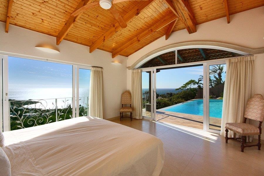 Bedroom 2 has a king size canopy bed with en-suite bathroom and dressing room, glass doors open directly onto the pool area.