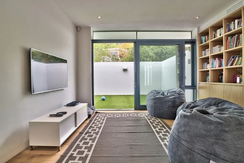 The second bedroom also has a corner position, this time with a view of Table Mountain. It is furnished with a Queen-size bed and has an en-suite bathroom with a shower. The remaining three bedrooms are on the middle entrance level, all with full en-suite bathrooms and doors opening onto a terrace. Two are furnished with Double four poster beds and one with a Queen-sized bed. There is also a TV and reading lounge on this level leading out to an enclosed astroturf sports courtyard where hours of tennis and soccer can be enjoyed.