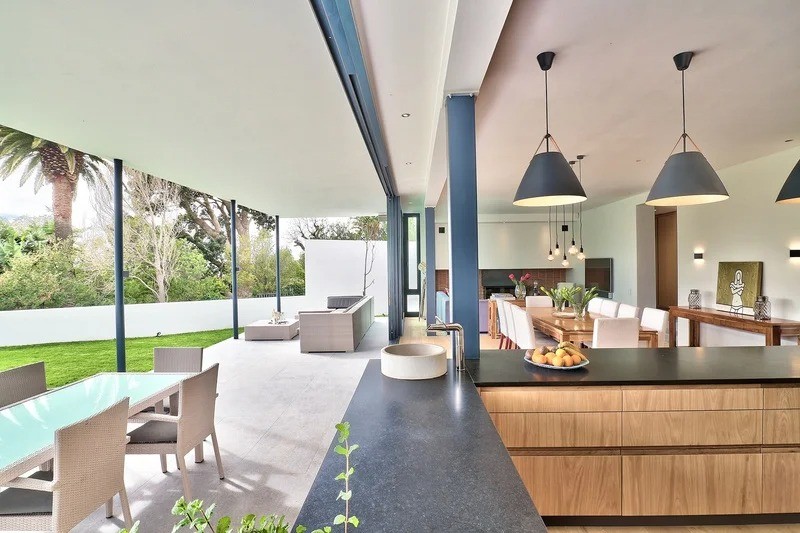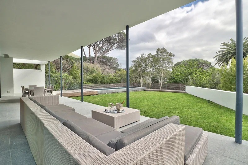 The cozy lounge area lies beyond the dining area and is furnished with comfortable couches for cozy relaxing. The indoor and outdoor living areas flow together seamlessly and spill out into the garden and the swimming pool deck beyond.