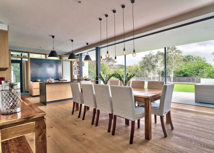 This open-plan space sees a fully equipped kitchen with honed granite tops overlooking the dining area and opening completely to the terrace with large sliding glass doors.