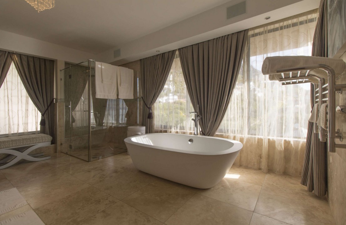 Three bedrooms all with spectacular views and a furnished veranda can be found on the entry level. The master bedroom is spacious with walk in wardrobe, patio and fabulous en-suite bathroom.