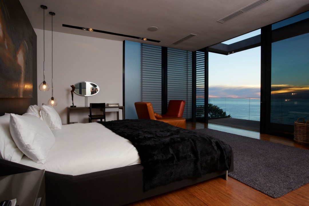 A master bedroom on the third floor boasts an uninterrupted ocean view that gives guests the illusion that they are floating on the water.