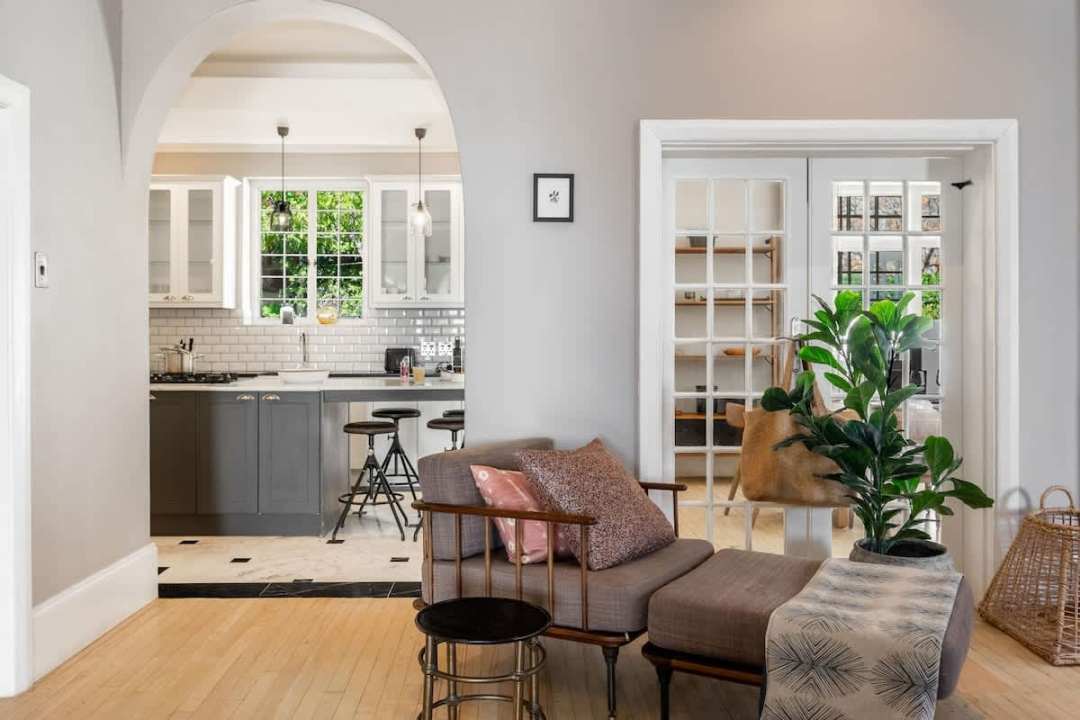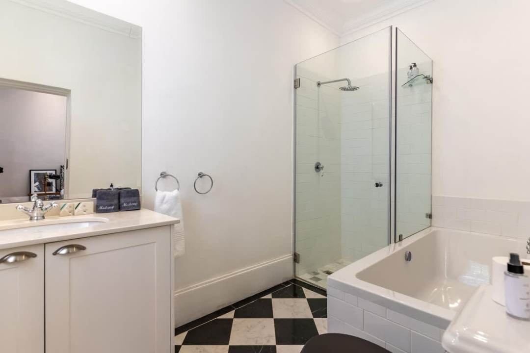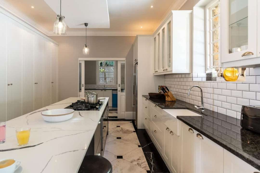 The living areas are warm and inviting: a comfortable lounge with TV and fireplace, a charming reading nook, and an elegant dining room for eight leading directly to a leafy courtyard for seamless indoor–outdoor living. The fully equipped kitchen, complete with modern appliances and a breakfast bar, is a delight for home cooks and private chefs alike.