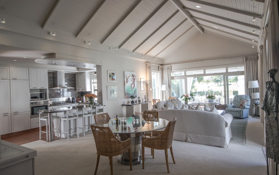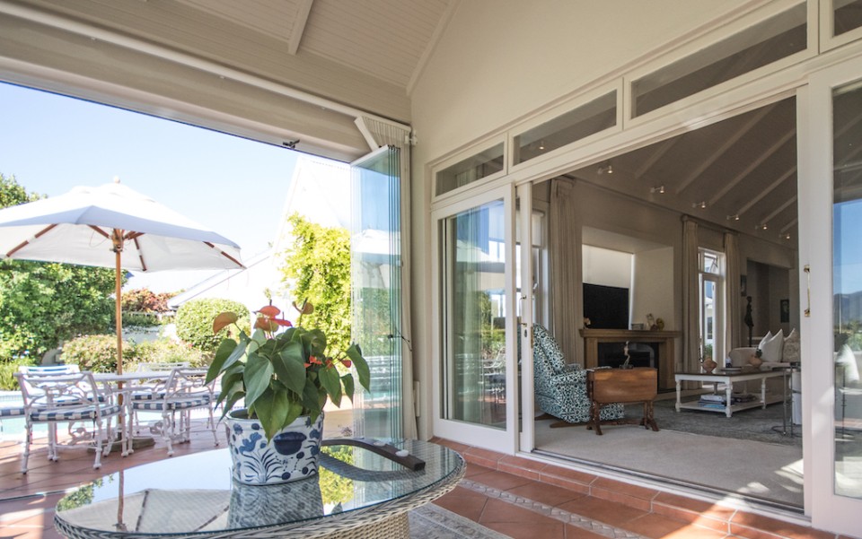Gorgeous views of Table Mountain, exterior greenery, flowering blooms, golf course and typically blue skies dominate the prolific scenery of this welcoming Constantia villa. On hot summer days, splash in the sparkling private swimming pool, or relax on a lounger overlooking the mesmerizing landscape. Enjoy an outdoor barbeque while soaking up the sheltered outdoors in the adjacent sunroom – a perfect combination. The open plan kitchen, dining room and lounge make for easy living, keeping everyone together.
