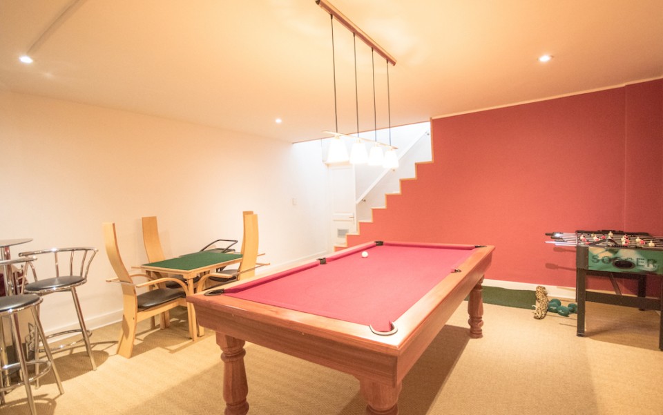 Games room downstairs with bridge and pool tables
