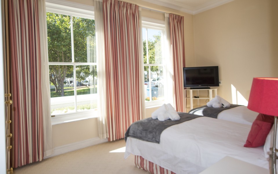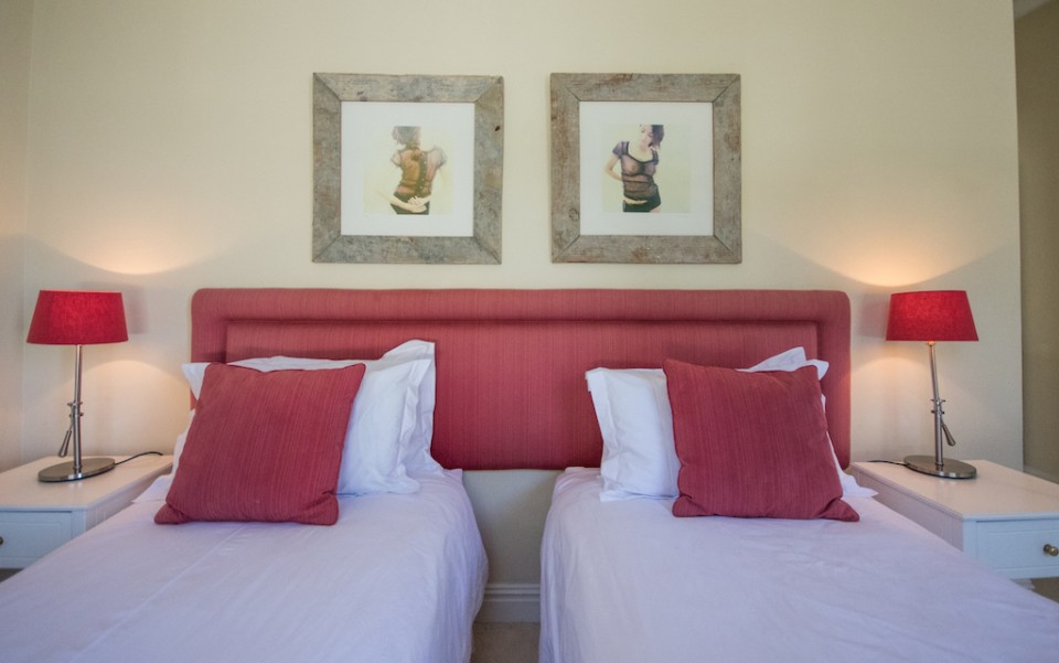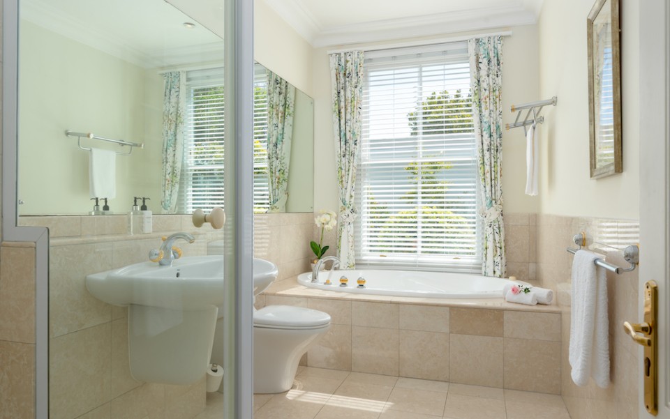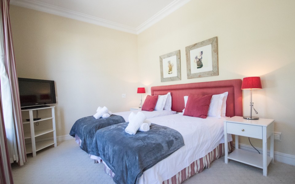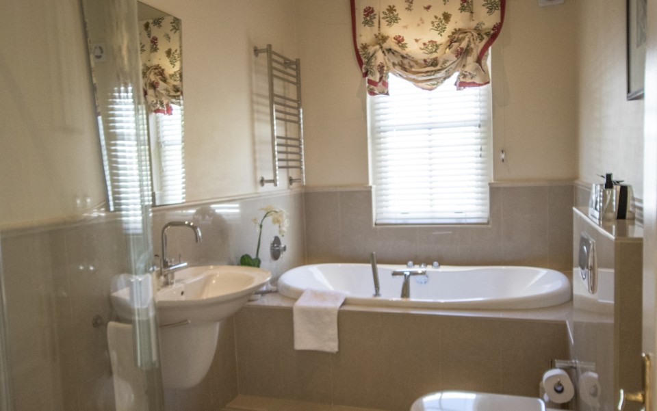Bedroom 3: 2 x single beds (can be made up as king upon request), TV, garden views. En-suite bathroom with jacuzzi-bath and walk in shower