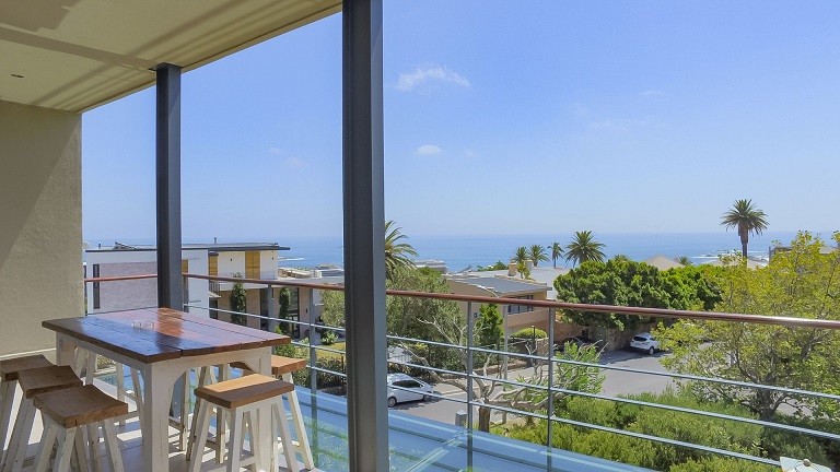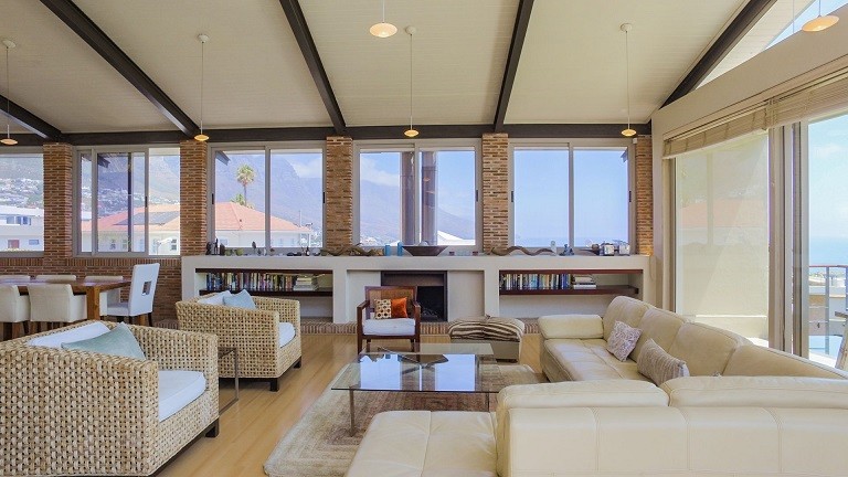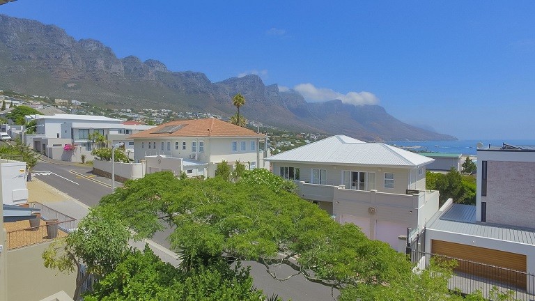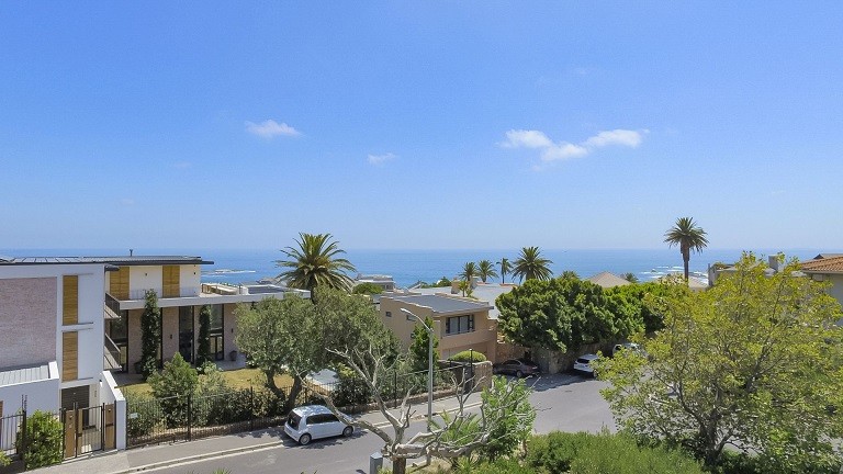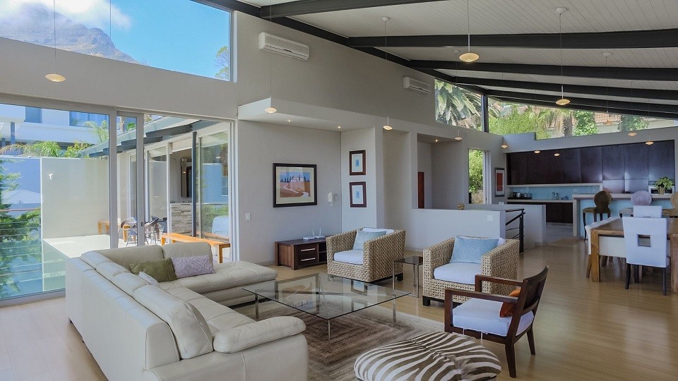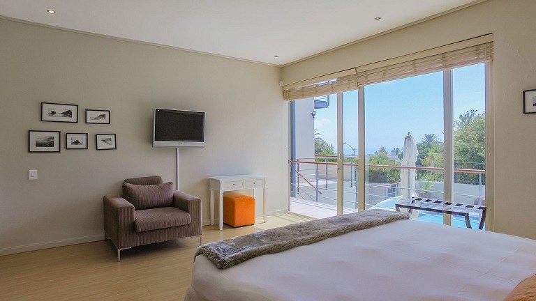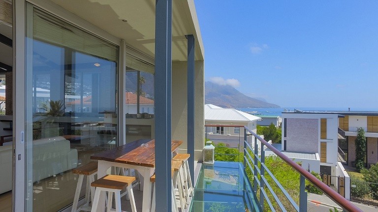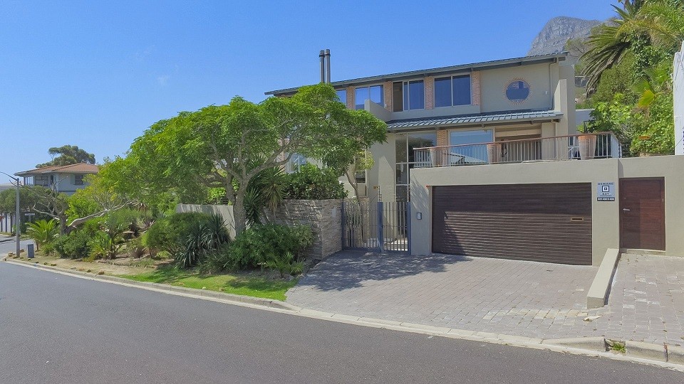 This beautiful home in a premier Camps Bay road achieves rare harmony between a breathtaking setting, quality yet comfortable finishes, and a homely ambiance. Set over three floors, it is configured to maximise its dramatic location. The double volume entry hall leads to a TV lounge from which doors open onto a sea-facing balcony. This floor houses a guest toilet and superb guest accommodation of four bedrooms, and beautifully appointed bathrooms with bath and shower. A second open staircase leads from this floor to the striking, open plan living/dining room, kitchen and master bedroom. Expansive windows bathe the entire space in natural light, inviting almost 360º enjoyment of spectacular views of the ocean, the Twelve Apostles and Lion’s Head. A focus on natural materials and a muted colour pallet emphasize the synergy with the environment, and tinted windows allow the sun’s warmth and light to permeate, whilst avoiding its glare. The master suite has a large sea-facing balcony. The luxury bathroom is integrated into the bedroom, with a separate WC. This property has numerous balconies, air-conditioning throughout, and a double garage. Comfortable, contemporary accommodation, in an unrivaled setting, just five minutes walk from the pristine beach and lively bars and restaurants of this world renowned destination, make this a superb choice for an unforgettable holiday.