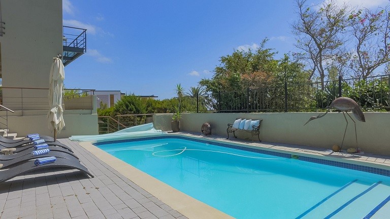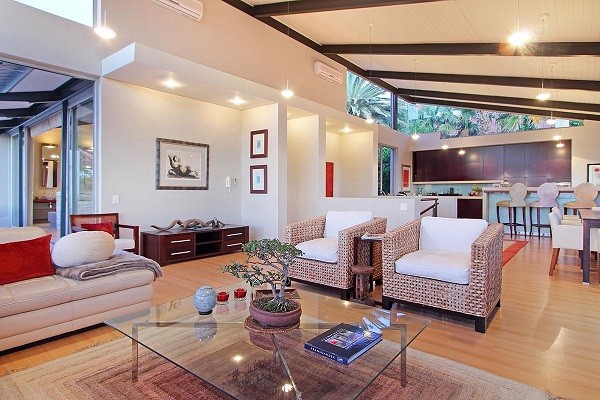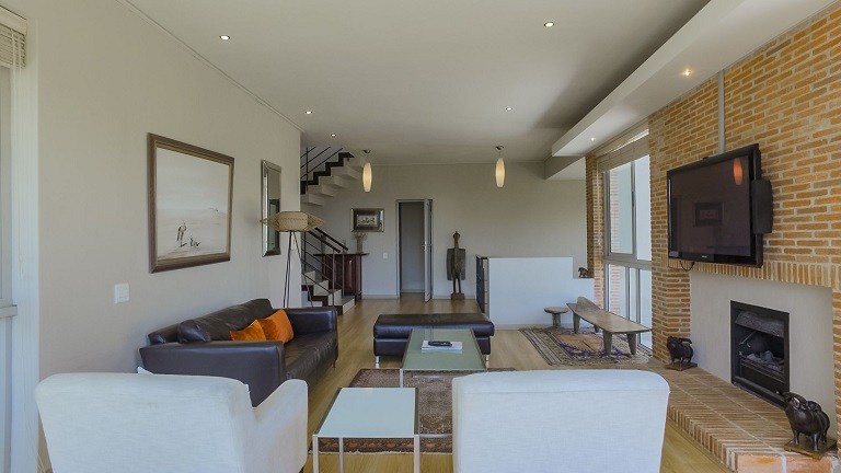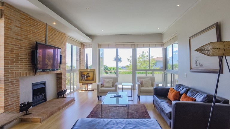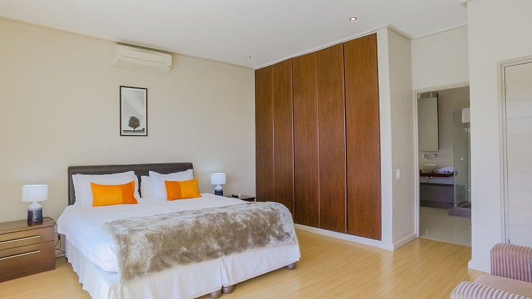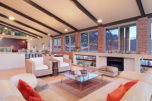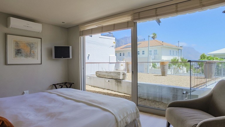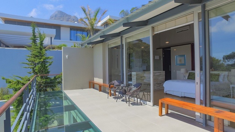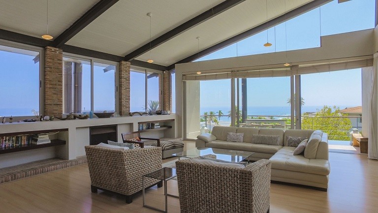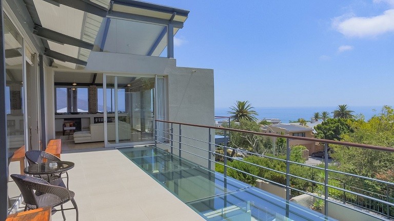 This beautiful home in a premier Camps Bay road achieves rare harmony between a breathtaking setting, quality yet comfortable finishes, and a homely ambiance. Set over three floors, it is configured to maximise its dramatic location. The double volume entry hall leads to a TV lounge from which doors open onto a sea-facing balcony. This floor houses a guest toilet and superb guest accommodation of four bedrooms, and beautifully appointed bathrooms with bath and shower. A second open staircase leads from this floor to the striking, open plan living/dining room, kitchen and master bedroom. Expansive windows bathe the entire space in natural light, inviting almost 360º enjoyment of spectacular views of the ocean, the Twelve Apostles and Lion’s Head. A focus on natural materials and a muted colour pallet emphasize the synergy with the environment, and tinted windows allow the sun’s warmth and light to permeate, whilst avoiding its glare. The master suite has a large sea-facing balcony. The luxury bathroom is integrated into the bedroom, with a separate WC. This property has numerous balconies, air-conditioning throughout, and a double garage. Comfortable, contemporary accommodation, in an unrivaled setting, just five minutes walk from the pristine beach and lively bars and restaurants of this world renowned destination, make this a superb choice for an unforgettable holiday.