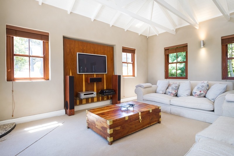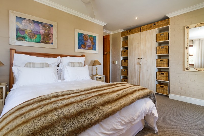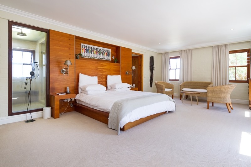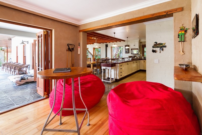 The entertainment room leads from the living area and includes a stunning Oregon bar and pub area with large flat-screen TV, including satellite, DVD and hi-fi system. The double doors open up onto the pool deck with outdoor table seating 8 for al fresco summer meals. This house is an outdoor entertainment delight for adults and children with Jacuzzi, all weather covered barbeque area, a pizza oven, trampoline, sun beds and a slide in the heated pool! The lawned garden has stunning views over Noordhoek to the beach and beautiful sunsets. The pool deck is sheltered from the South-Easter, Cape Town’s summer wind, so you can enjoy the views at any time. The spacious upstairs loft has a TV lounge equipped with flat screen TV with satellite channels, DVD, video and Hi-Fi system, a wood-burning fireplace and a library and reading area. The villa has ADSL for easy internet access.