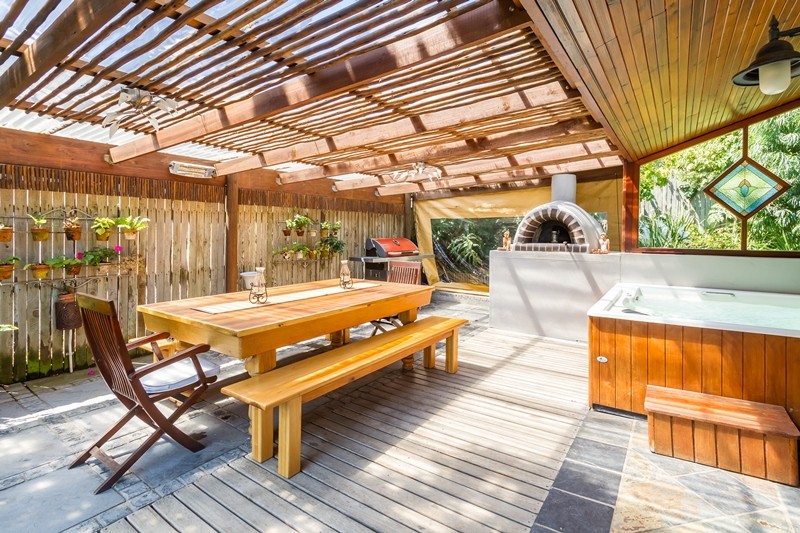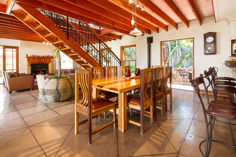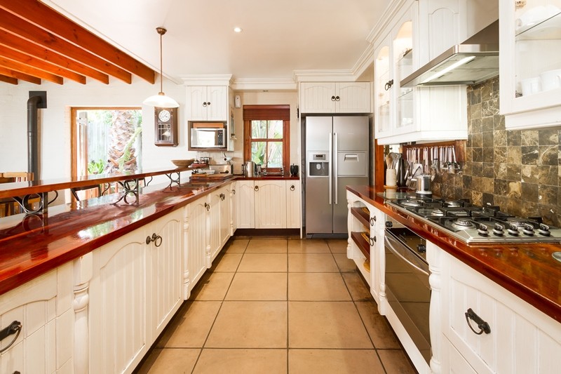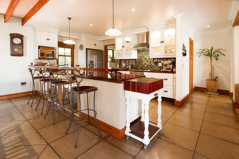 The downstairs lounge leads to the pool deck outdoor area and also has doors leading to the covered Jacuzzi area. The open-plan design creates light and space and easy flow between dining, kitchen and living areas. Under-floor heating, as well as a wood-burning fireplace in the lounge and gas fireplace in the dining room provide warmth on cool evenings. The dining table comfortably seats 8 and easily converts into a pool table simply by removing the top. The breakfast counter seats 4. The fully equipped open plan Provençal-style kitchen with modern appliances could inspire creating delicious family meals. This home is immaculately well maintained and of high quality standards.