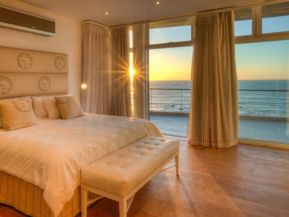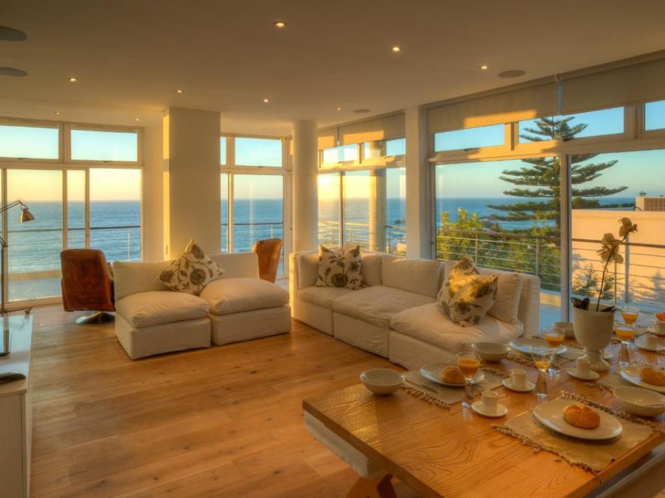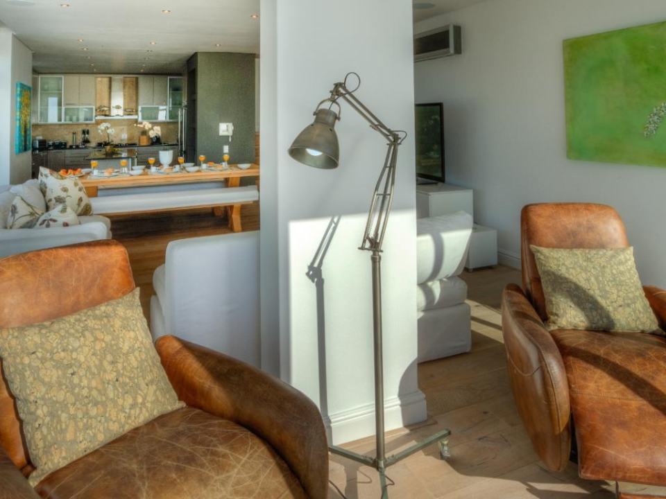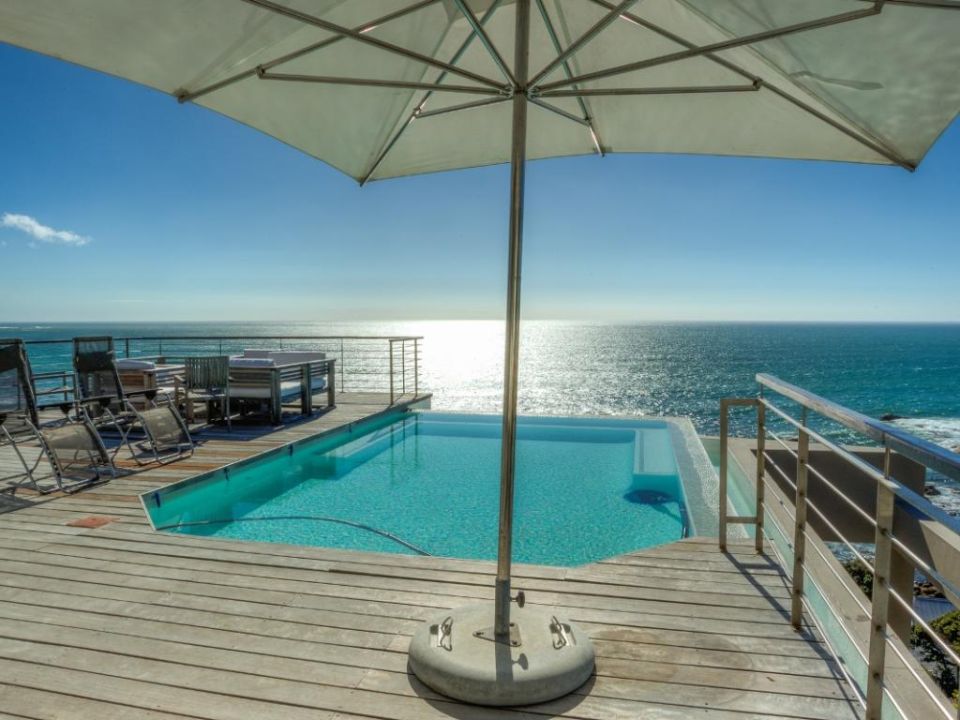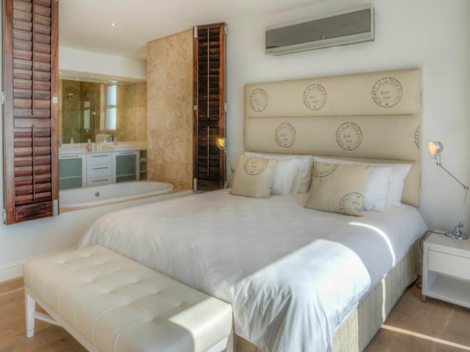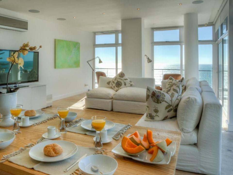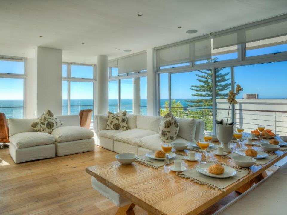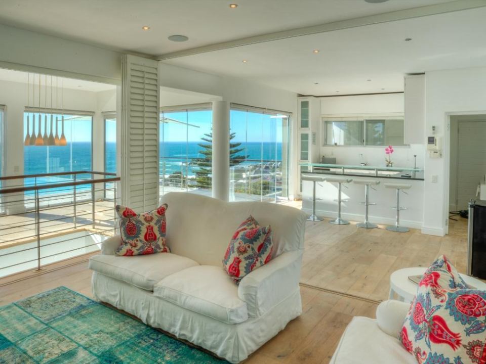 A well-designed duplex penthouse, styled in cool whites and natural finishes, invites relaxation and is the perfect retreat for serene holidays. A funicular takes you up to the front door of the property. The entrance and ground level of the property features two of the three en-suite bedrooms. These are immediate to your right as you enter this magnificent home. As you make your way into the entrance hall, several steps lead down into the sunken lounge and open-plan living room, dining room, and kitchen. The Master bedroom leads off to the living room and shares a decked balcony that wraps around the property back to the living room and kitchen. On the upstairs level, you will find a stylish family room and indoor bar. These seamlessly lead onto the large, elegantly furnished roof deck from which you will enjoy a 360-degree view of the Atlantic Ocean, Table Mountain reserve and Twelve Apostles, and your private pool.