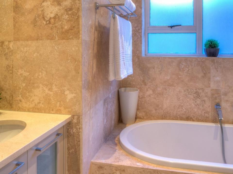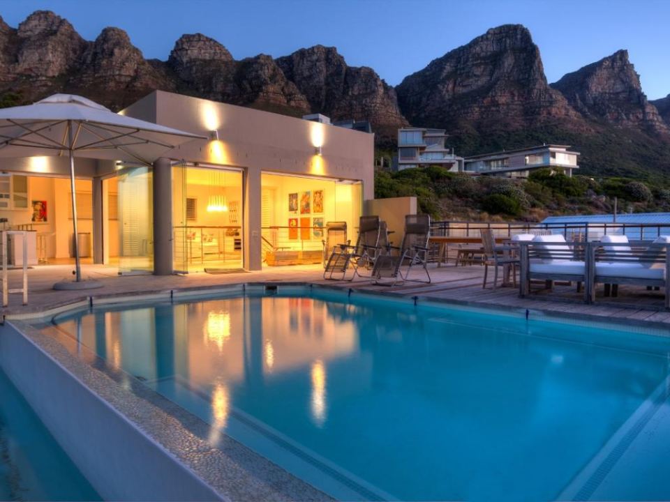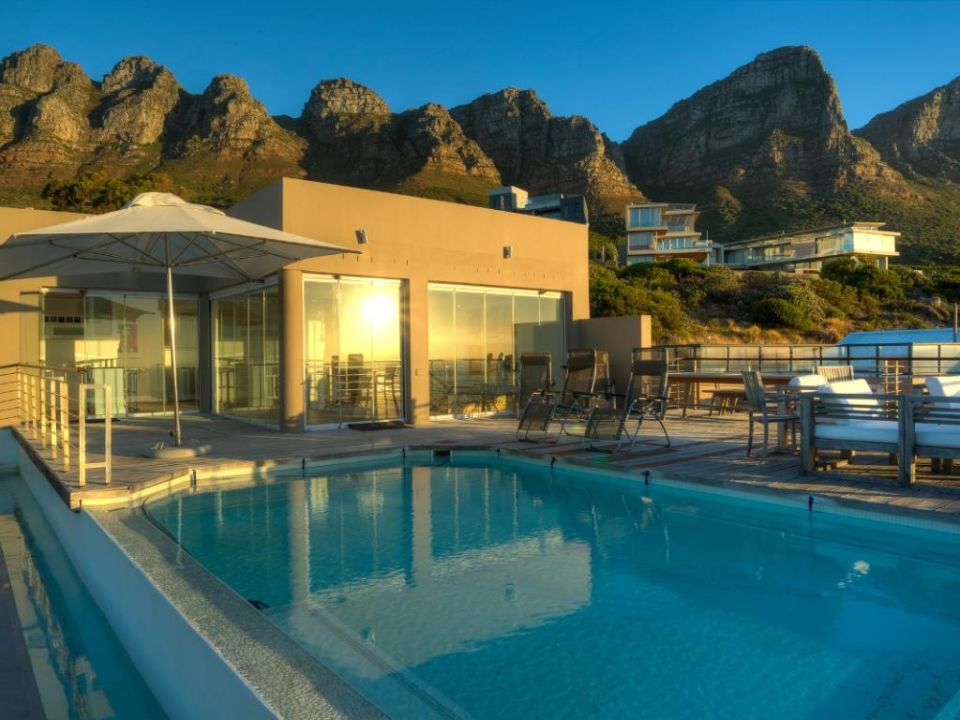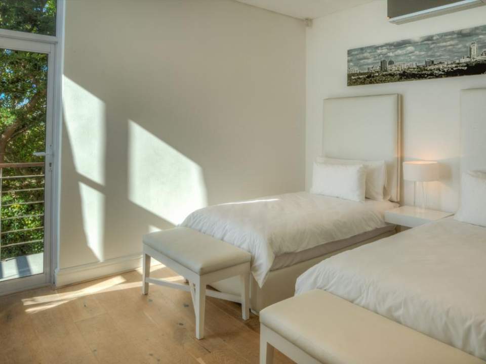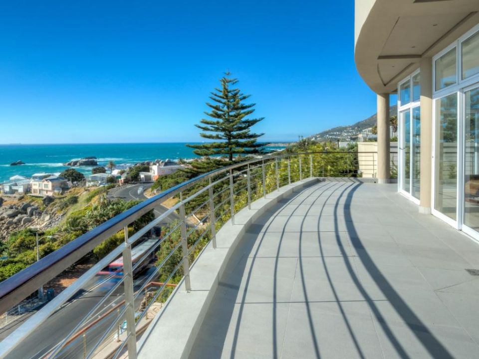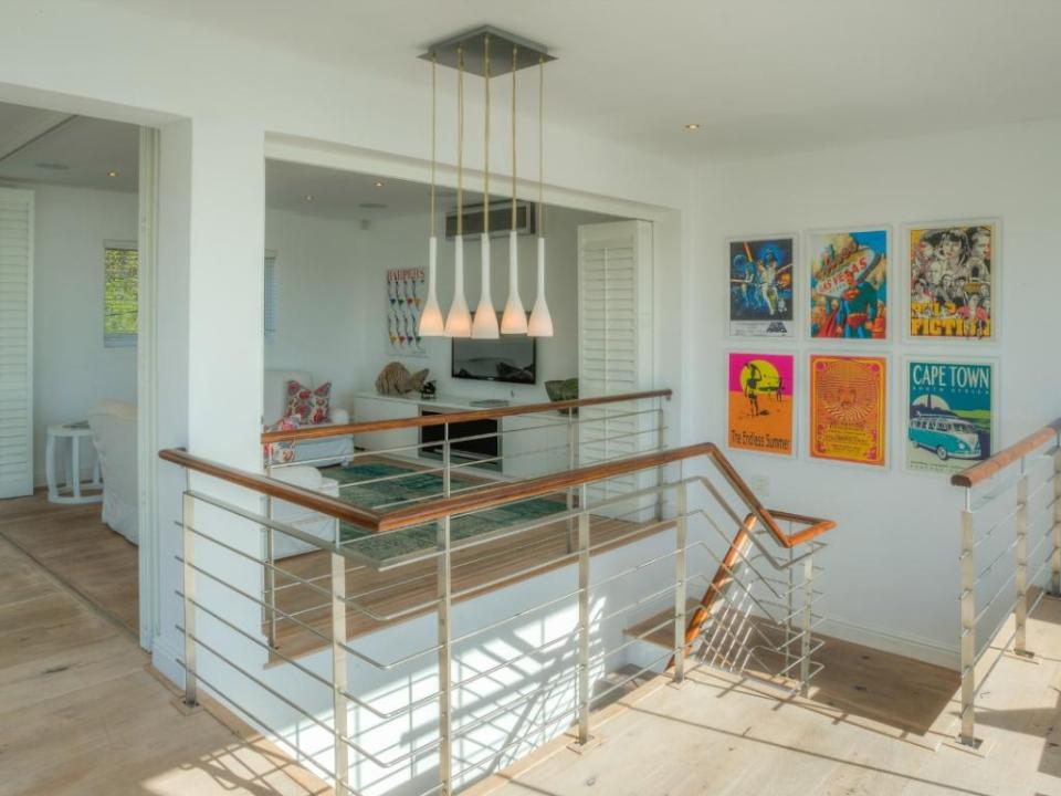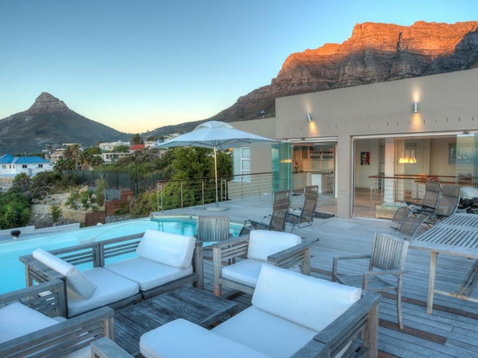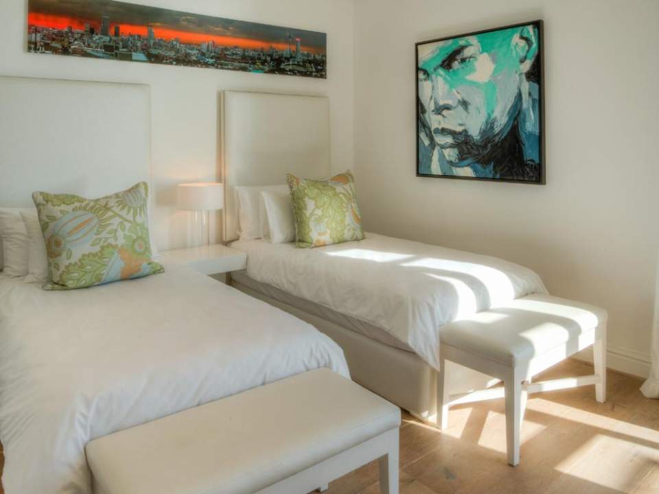 A well-designed duplex penthouse, styled in cool whites and natural finishes, invites relaxation and is the perfect retreat for serene holidays. A funicular takes you up to the front door of the property. The entrance and ground level of the property features two of the three en-suite bedrooms. These are immediate to your right as you enter this magnificent home. As you make your way into the entrance hall, several steps lead down into the sunken lounge and open-plan living room, dining room, and kitchen. The Master bedroom leads off to the living room and shares a decked balcony that wraps around the property back to the living room and kitchen. On the upstairs level, you will find a stylish family room and indoor bar. These seamlessly lead onto the large, elegantly furnished roof deck from which you will enjoy a 360-degree view of the Atlantic Ocean, Table Mountain reserve and Twelve Apostles, and your private pool.