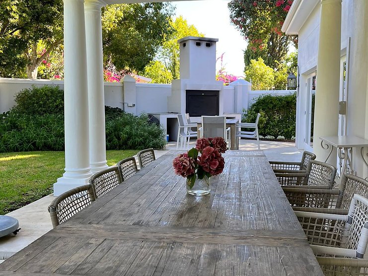 Outdoor living is at the heart of this Constantia villa. Guests can enjoy two swimming pools, sun-drenched patios, and multiple deck areas ideal for alfresco dining or relaxed afternoons. Surrounded by greenery and framed by mountain views, the outdoor spaces provide a peaceful escape for all ages.