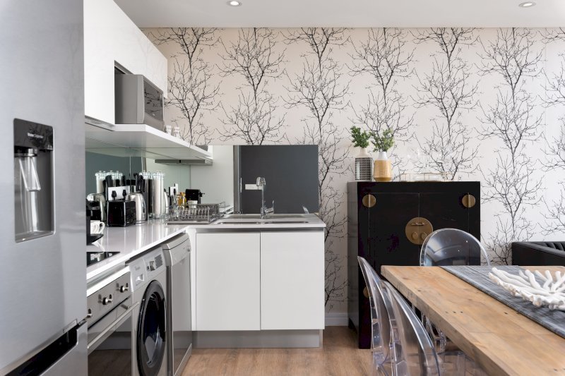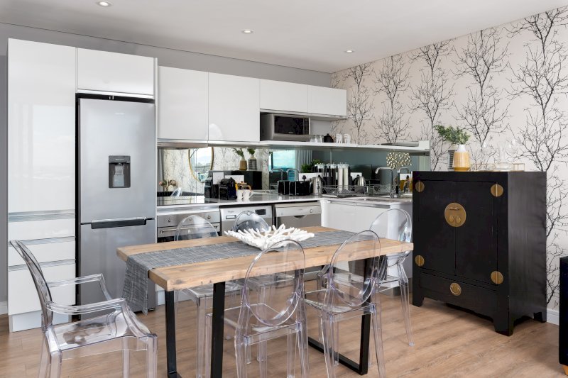 Open-plan living area consisting of lounge, dining area, and modern, fully-equipped kitchen. Sliding doors opening onto balcony.