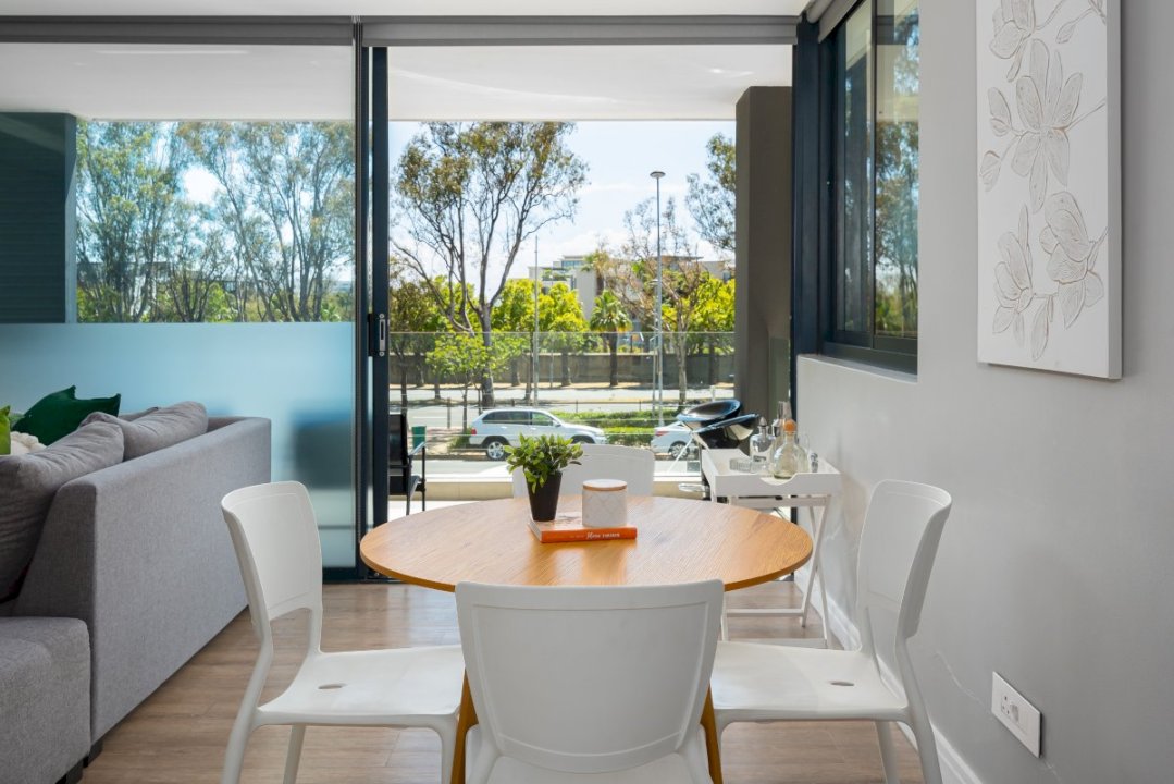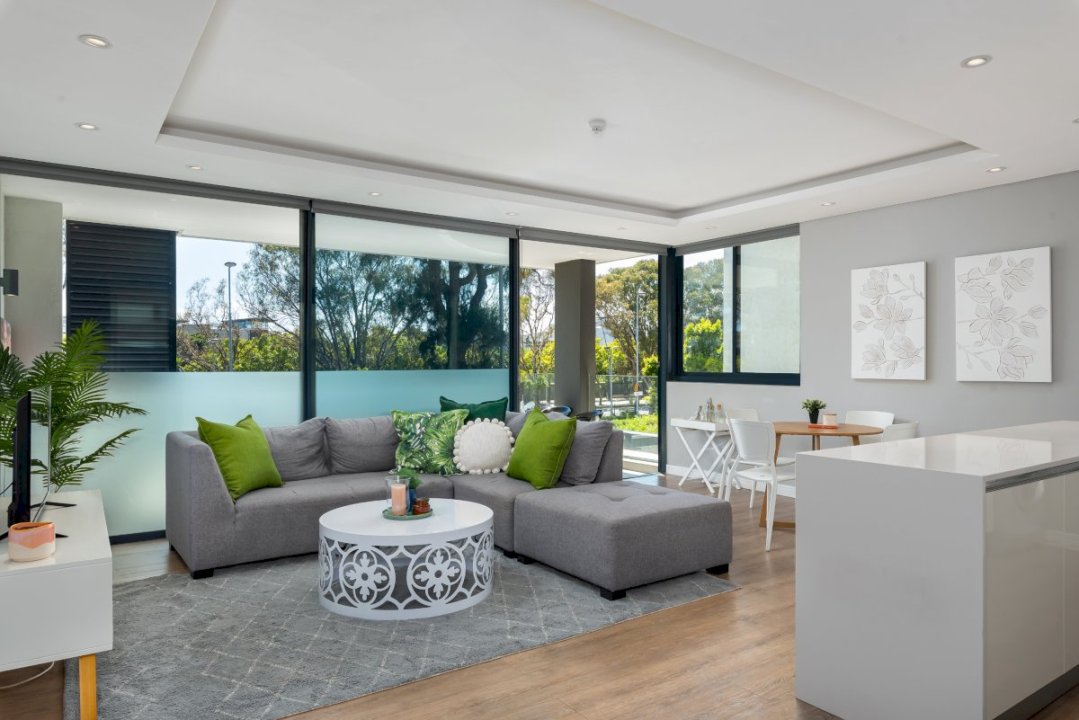 Open-plan living area consisting of lounge, dining area, and modern, fully-equipped kitchen. Sliding doors opening onto balcony.