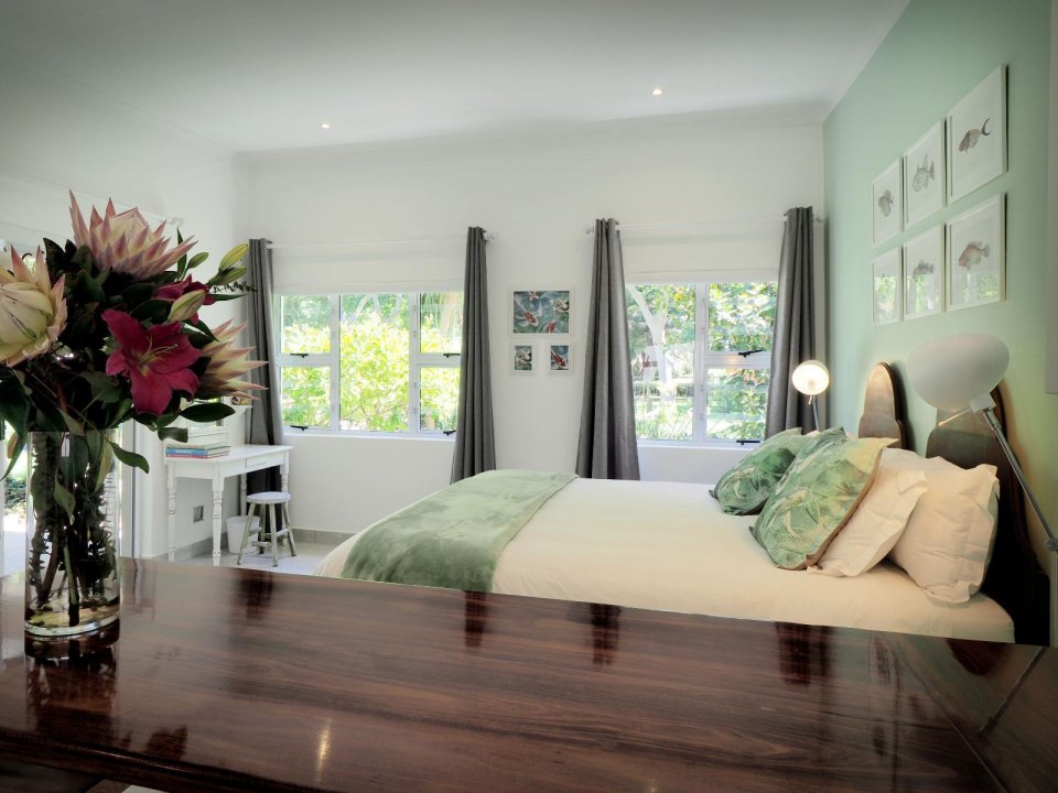 Hibiscus Cottage offers a main room with queen size bed, bathroom and private garden with outdoor shower. Bedroom 2 has 2 single beds and a bathroom. The unit has a full kitchen and living room as well as a large covered patio and braai area.
