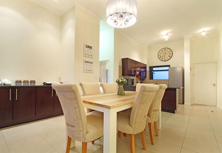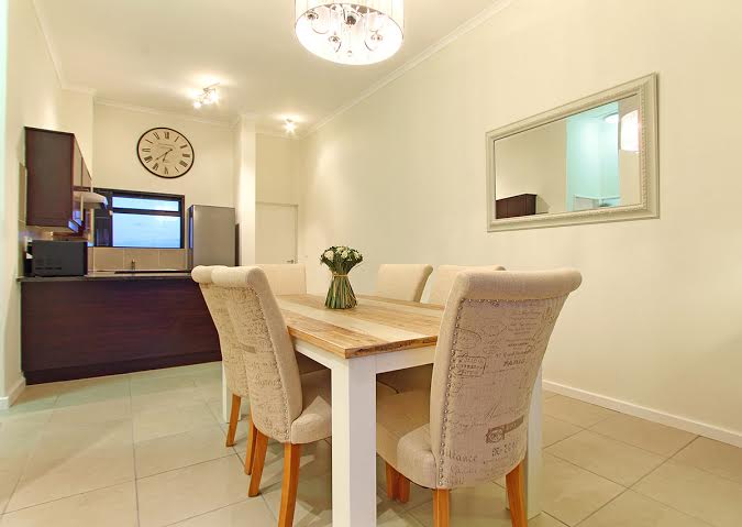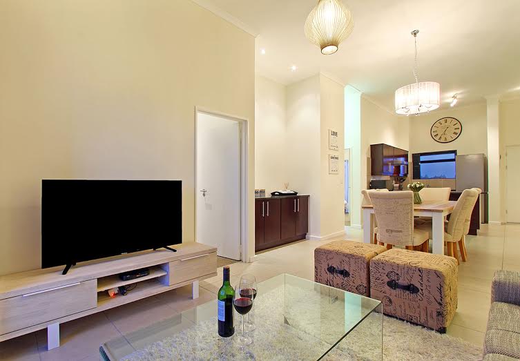 The dining area comes with a long table with luxurious seating for 6. The lounge area has lavish seating, a sleek glass coffee table and is where guests can relax with a large LED television as well as DSTV bouquet. From here, via full-height sliding doors, travellers can enjoy gorgeous, elevated views of the area of Century City. The sliding doors in the lounge lead outside to the balcony featuring a BBQ grill.