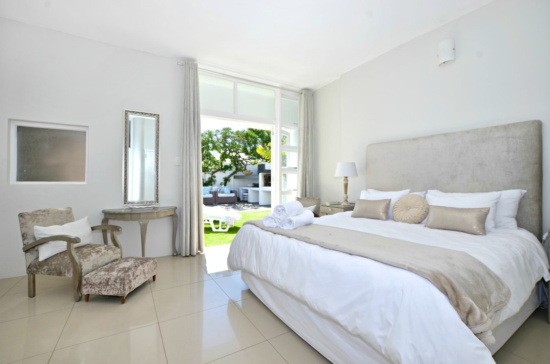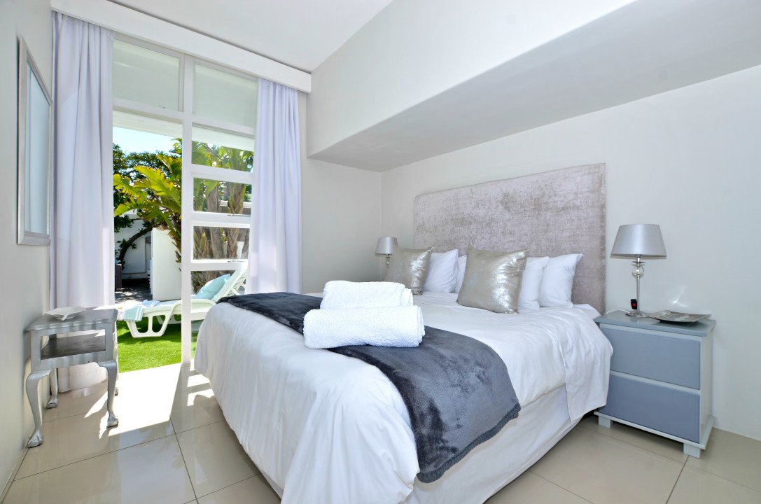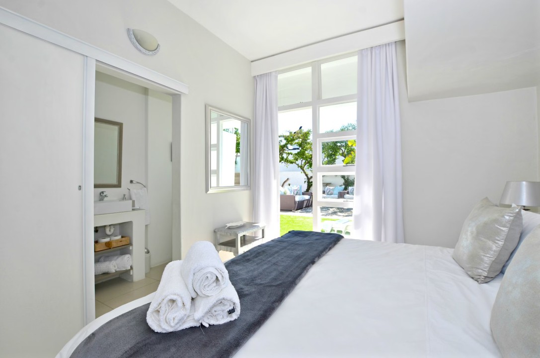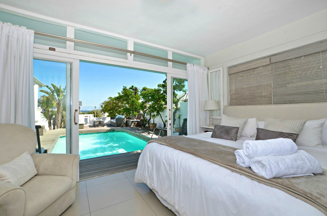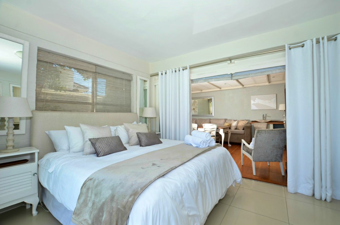 Platinum Bedroom 4: Extra-length king bed (or two singles), magnificent views of Robben Island and the bay, seating area, and access to a large downstairs bathroom with walk-in shower.