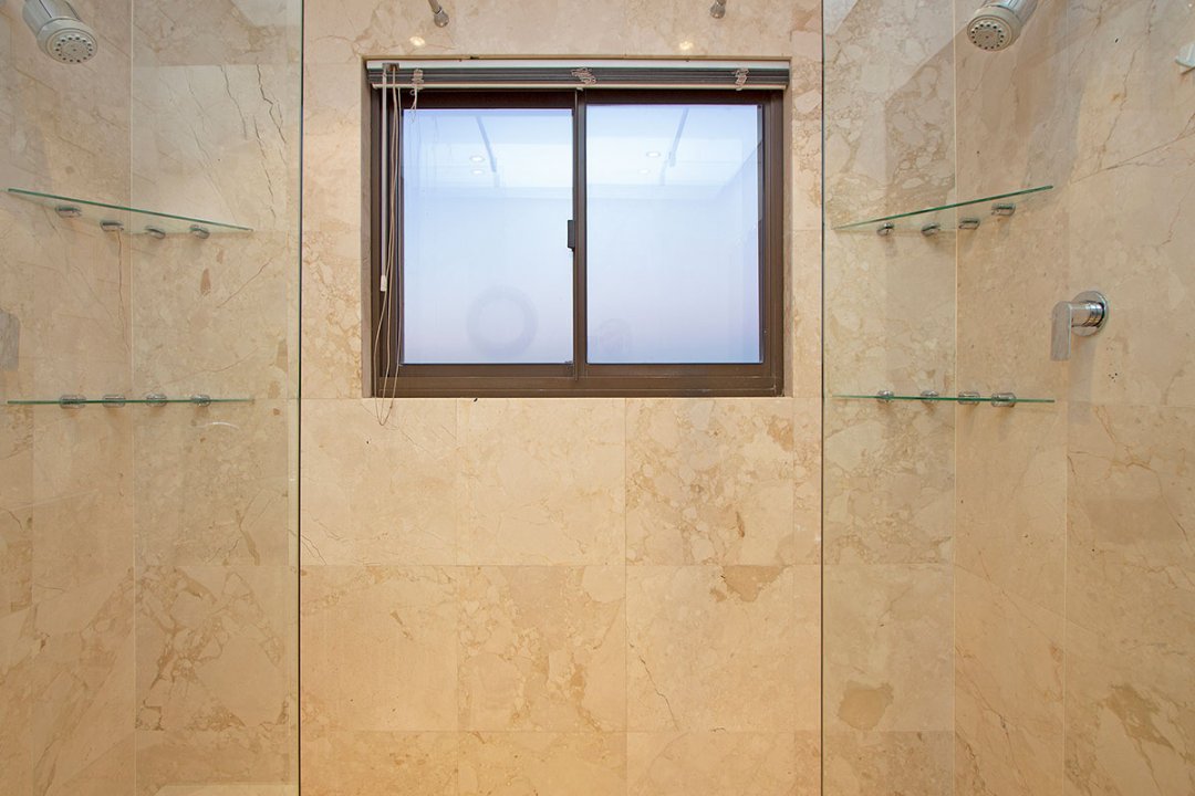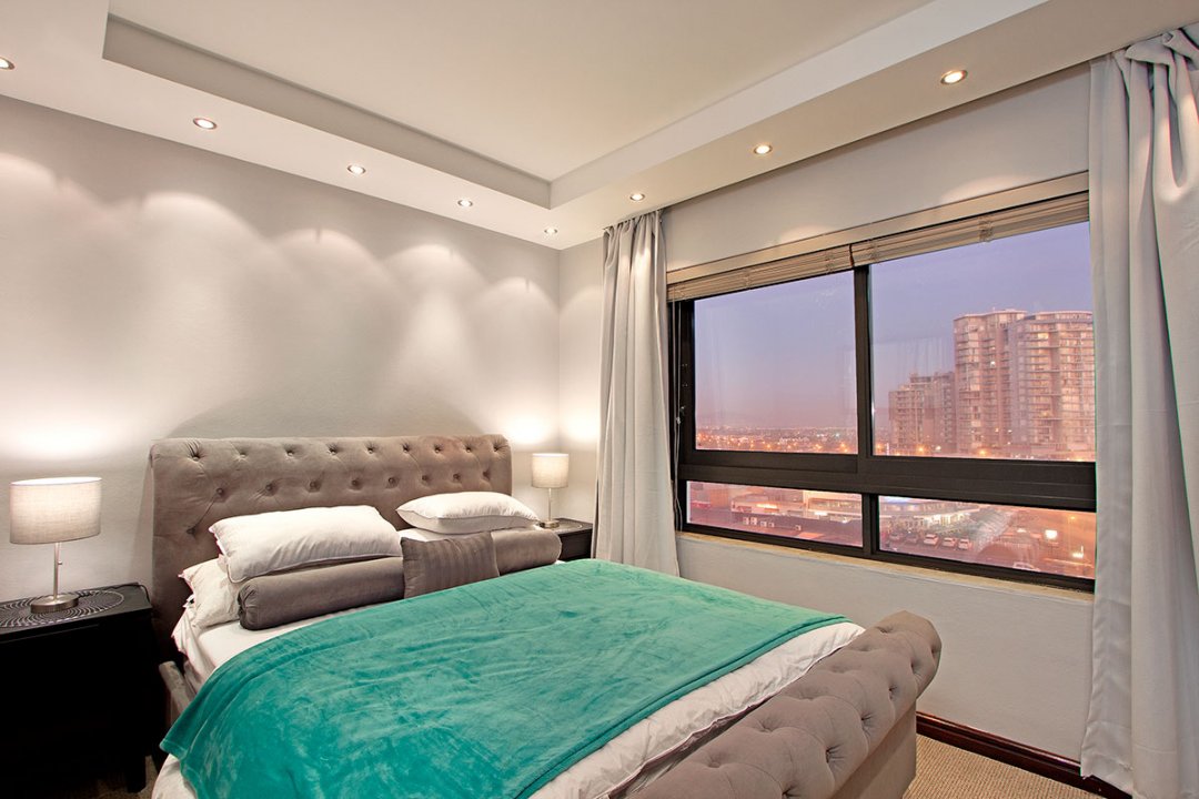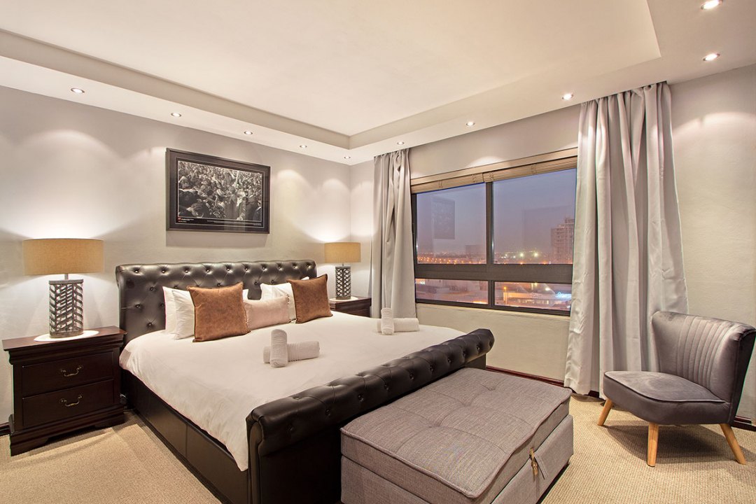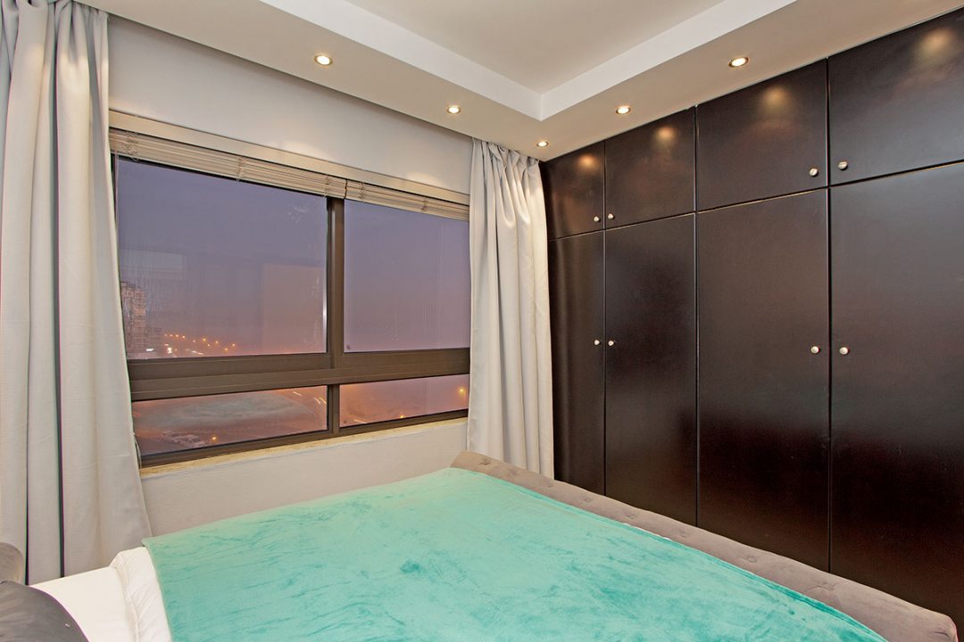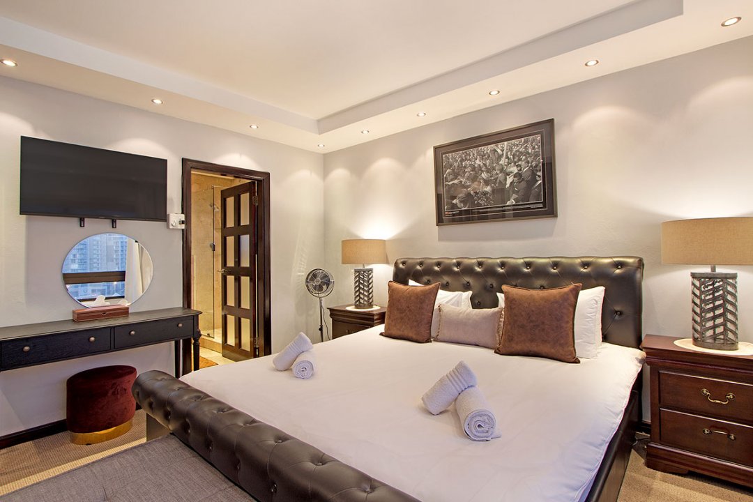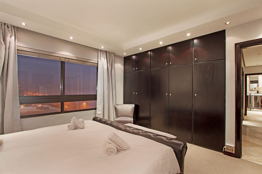 - Master bedroom with King (extra length) bed, vanity table, smart TV, floor to ceiling window views of the beachfront and city lights, en-suite bathroom featuring double walk-in shower.