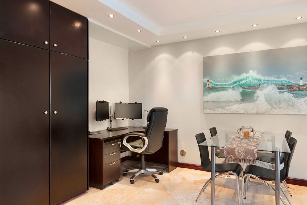 - Remote work setup featuring stand-alone workspace, dual monitor and video conferencing equipment (30/30 Mbps Uncapped Fibre line).